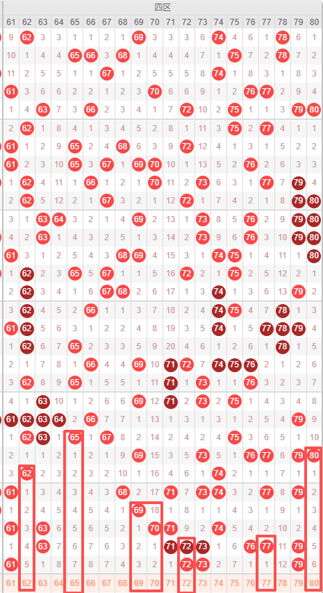 四区:最近四区10期出号情况为:5 6 5 6 2 7 1 5 7 4,总出号情况为48个,平均出号4.8个,本期四区号码推荐:62 65 69 70 72 77 80。重点关注:62 65 70 72 77 80。