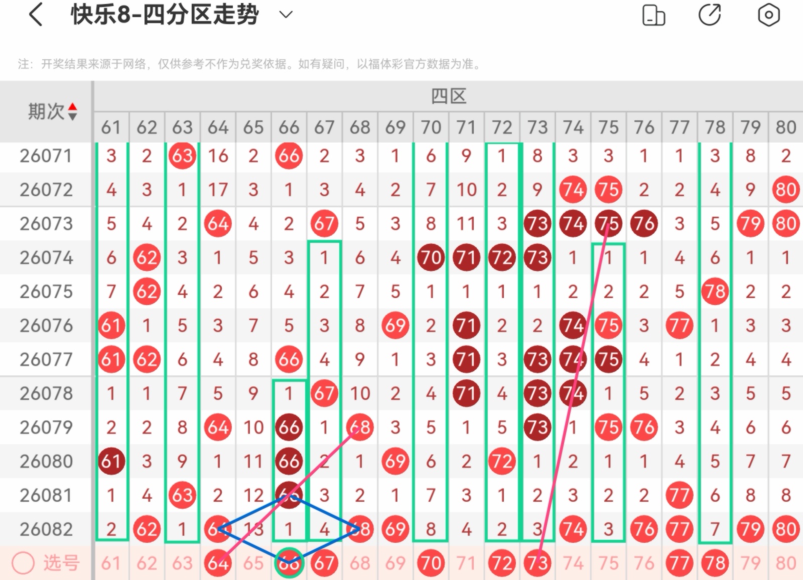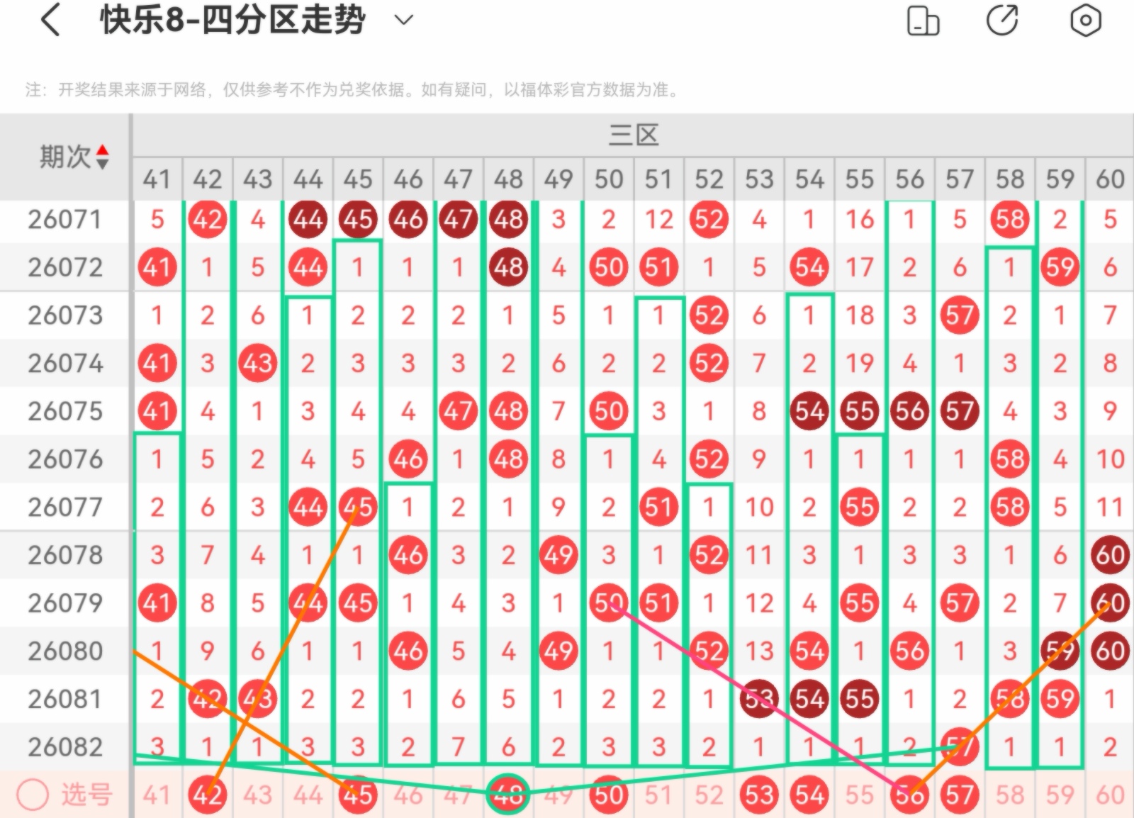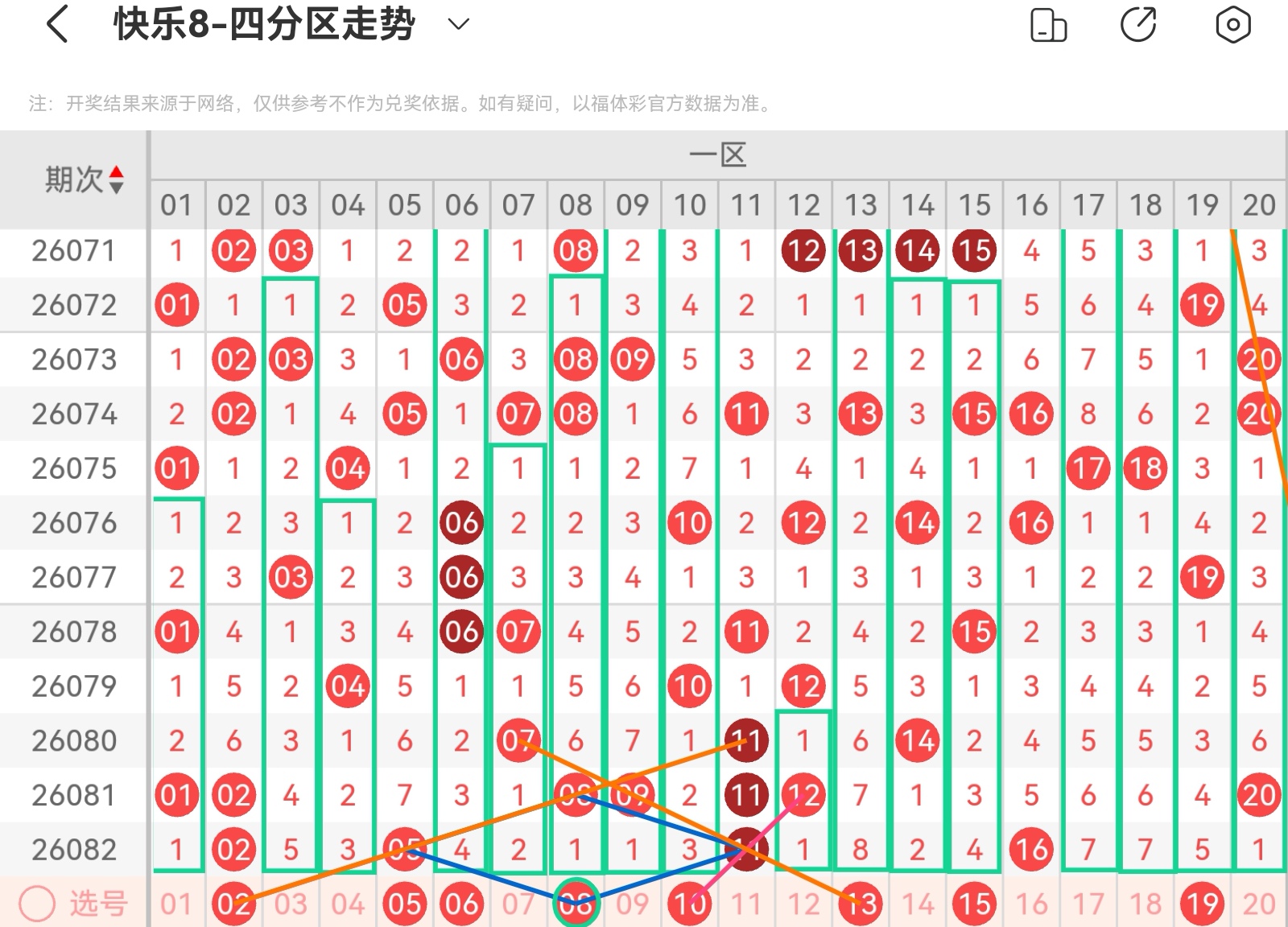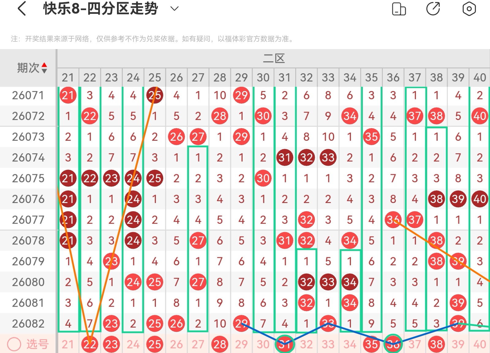 大家好,我是甜丝丝的坏事,主要以快乐八的形态走势、空位走势、遗漏走势以及斜连走势相结合的方法,用公认的四分区走势来进行预测分析,希望能让你有所收获。