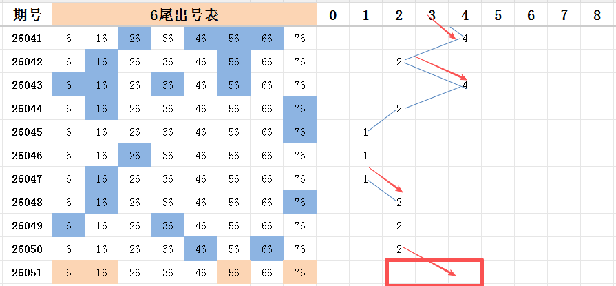 本期看好开出的范围是两码走势至四码走势之间。六尾上期开出两码走势,本期号码56是三斜连的号码走势,36-46-56,属于比较有规律的号码走势,如果本尾能开出多码走势,那么有规律的号码大概率会开出。看好两个首码:号码06和号码16能开出其中一码。