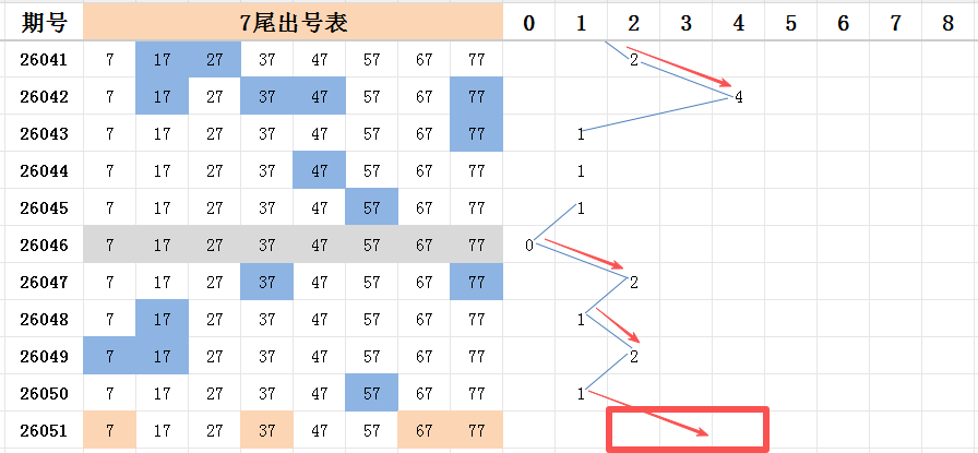 本期看好开出的范围是两码走势至四码走势之间。上期七尾开出一码走势,本期看好两个尾码:号码67和号码77能开出其中一码。另外看好遗漏1期的号码07,属于一区的号码。遗漏三期的号码37,属于四区的号码。