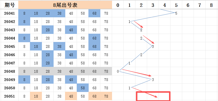本期看好开出的范围是两码走势至四码走势之间。八尾上期开出一码走势,本期号码68是三斜连的号码走势,48-58-68,属于比较有规律的号码走势,如果本尾能开出多码走势,那么有规律的号码大概率会开出。另外上期开出号码58的两个邻码:号码48和号码68,看好能开出其中一个。