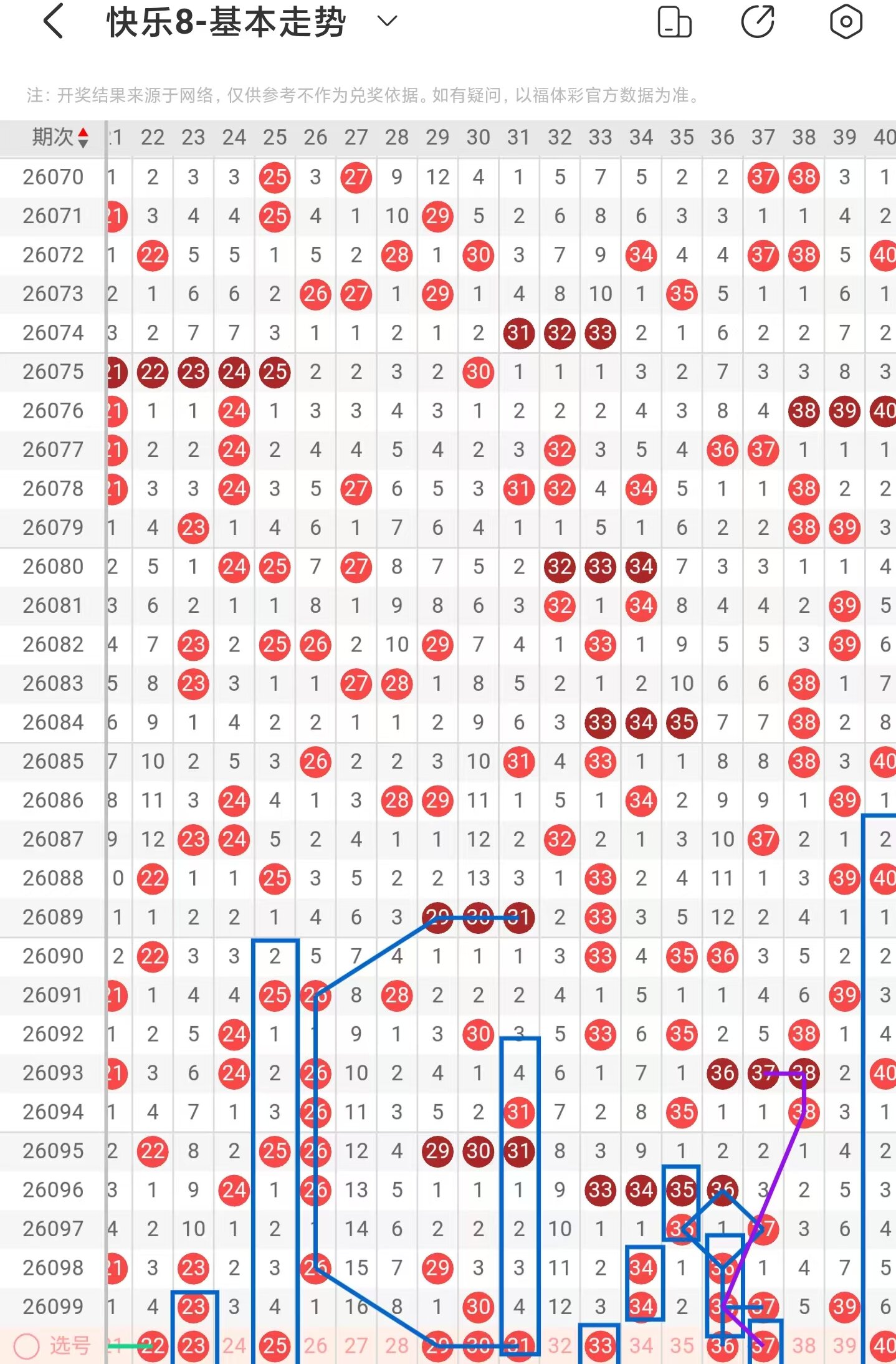 二区间稳定落号,一共开出六个号码球,本期考虑减少号码球的数量,防守22号码球,阶梯落位重码走势注意23、33、37号码球,注意隔期递增的25号码球,以26号码球为对称走势起点,注意走势形态的29、30、31号码球,同时31号码球也是隔期对称回补号码球,同时37号码球也是百期相似形态号码球,注意36号码球也是近期相似形态号码球,注意隔期递增的40号码球,因此二区间关注22-31-36-37-40,注意本区间的选二复式36-37-40。