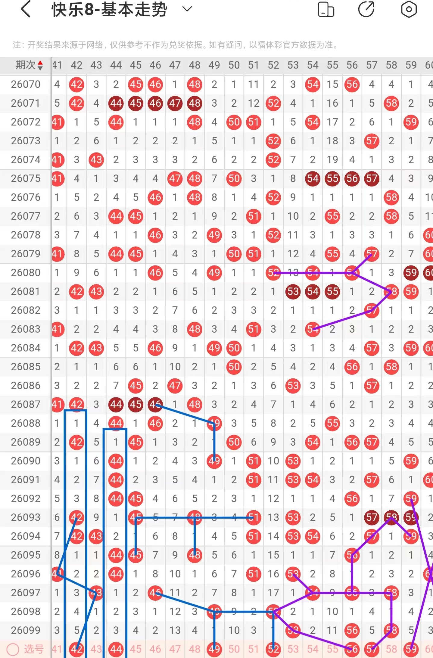 三区间上期稳定落号,一共开出三个号码球,本期考虑增加号码球的数量,注意隔期递增的42号码球,同时也是百期相似形态号码球,注意隔期递增的44号码球,以43号码球为对称走势起点,注意走势形态的49、52号码球,近期46、49号码球的走势相似,本期注意49号码球,近期53、54、56、58号码球的走势与52、54、56、57号码球的走势相似,本期注意56号码球,近期56、57、58号码球的走势与63、64、65号码球的走势相似,本期注意57号码球,注意斜连走势回补的59号码球,因此三区间关注42-49-52-56-57,注意本区间的选二复式42-49-57。