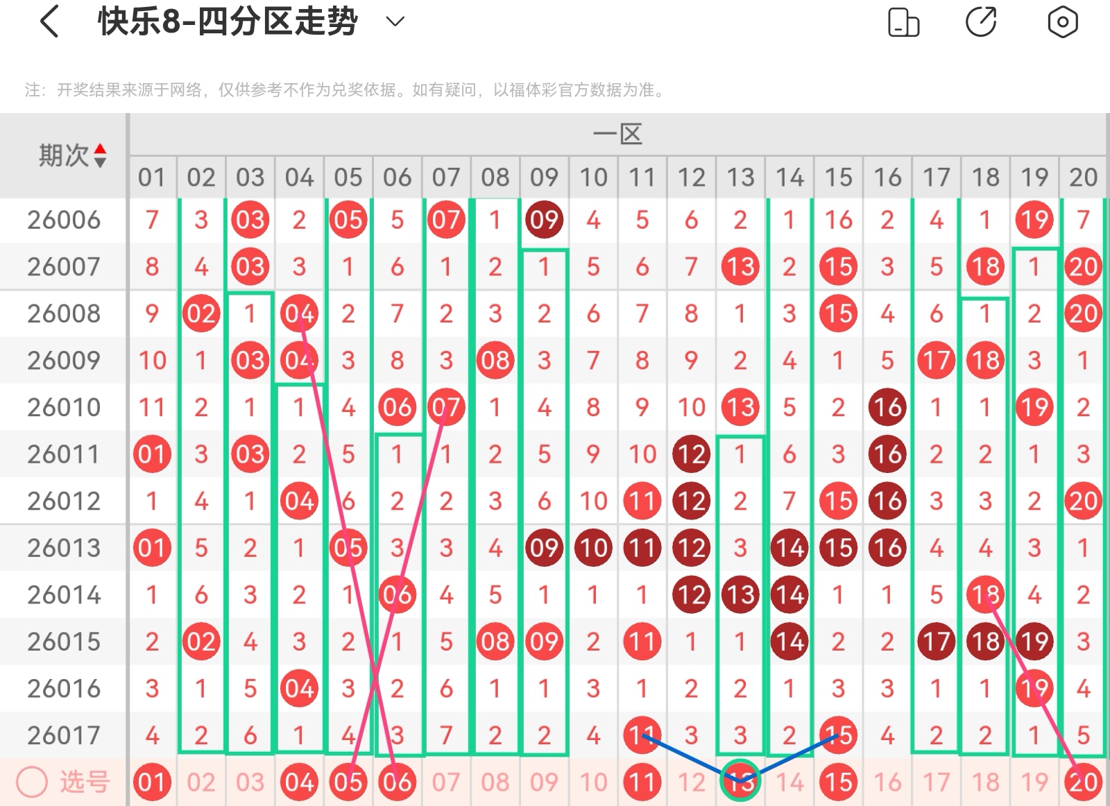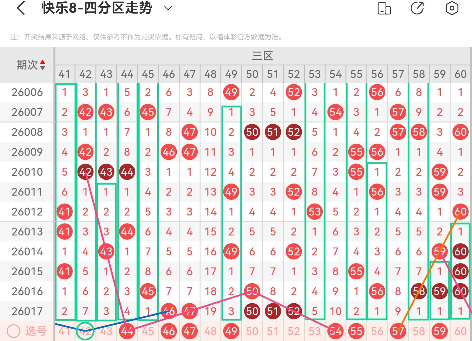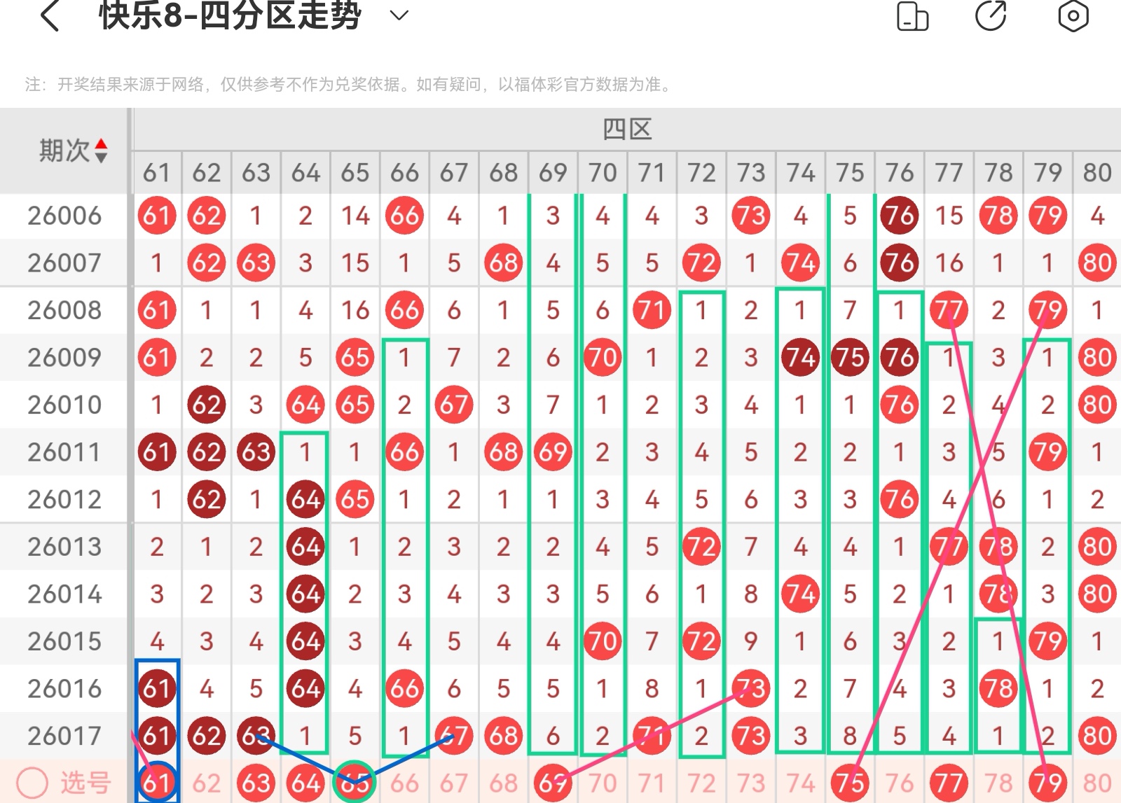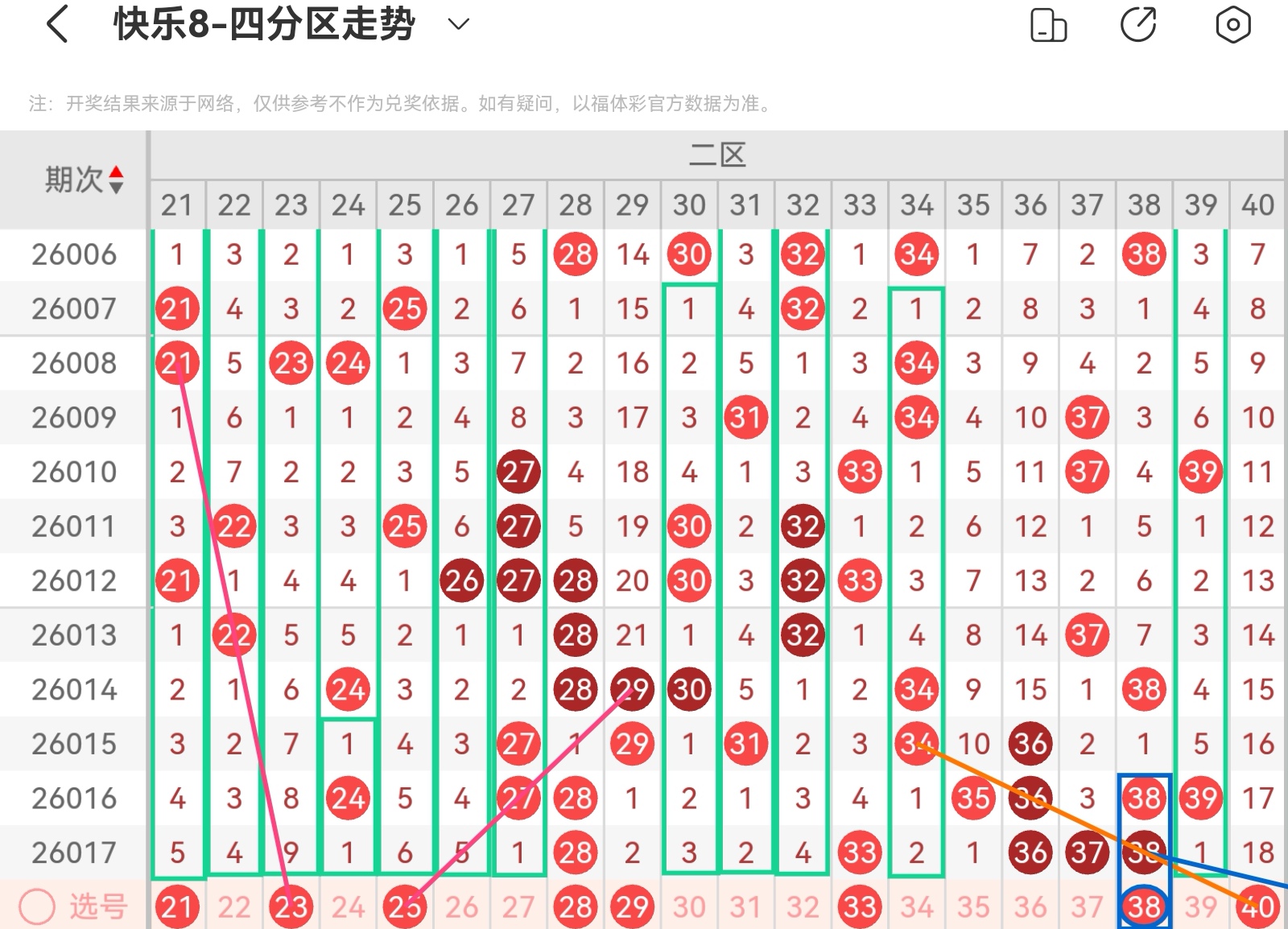 大家好,我是甜丝丝的坏事,主要以快乐八的形态走势、空位走势、遗漏走势以及斜连走势相结合的方法,用公认的四分区走势来进行预测分析,希望能让你有所收获。
