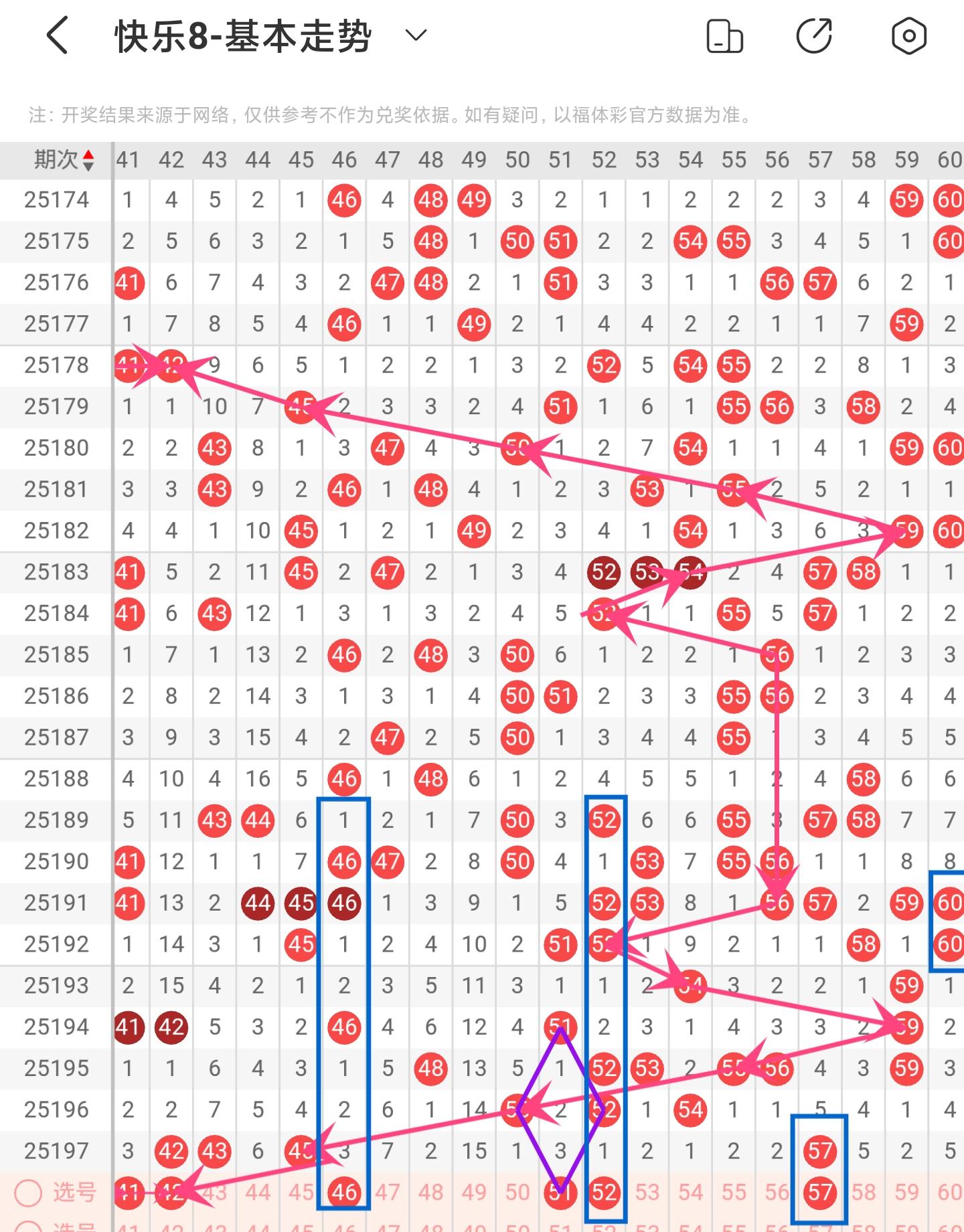 三区间上期稳定落号,一共开出四个号码球,本期考虑增加号码球的数量,防守菱形形态的51号码球,阶梯落位重码走势注意关注57号码球,注意期数增减法注意关注41、46、58、60号码球,以56号码球为对称走势起点,注意走势形态的41、42号码球,阶梯落位连码走势注意51、52、53、54号码球,因此三区间关注41-42-46-51-52-57-58-60。