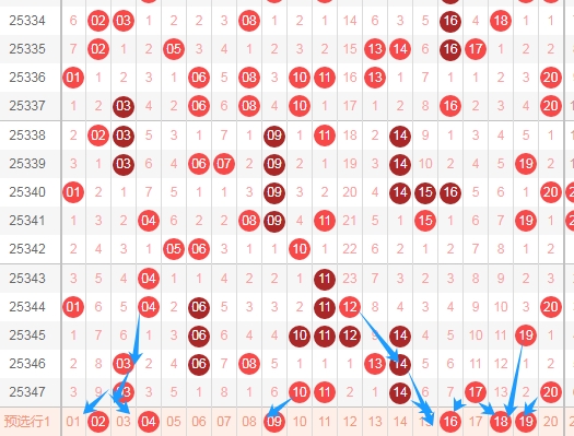 到第2025348期冷号码冷十期以上的号码还有18 27 54 57,上期出现了7个重复号码,隔一期的号码有5个,既然重复的号码有7个,隔一期的号码有5个,那么这几个冷号码数字18 27 54 57可以关注出1个或者2个,或者3个。