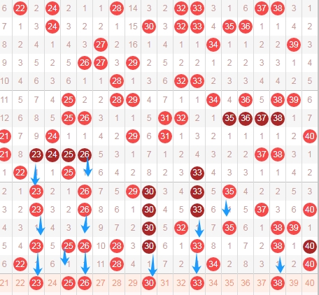 上图是福彩快乐8开奖号码分布走势图中的第二个区域,我用蓝色箭头表示的最近号码之间的特点都是隔一期的数字,那么本期个人觉得应该继续关注隔一期的数字23 25 26 30 33 38出3个或者4个。