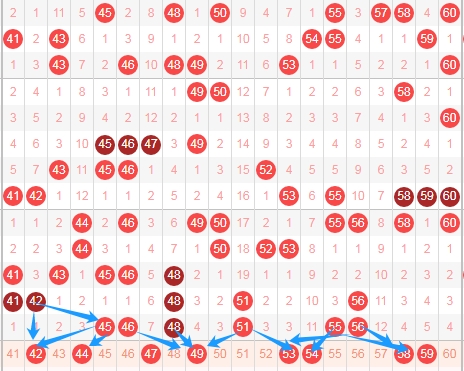 上图是福彩快乐8开奖号码分布走势图中的第三个区域,我用蓝色箭头表示的最近号码之间的特点,本期个人觉得应该关注这些数字42 44 47 49 53 54 58 59出3个或者4个。