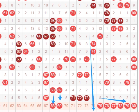 上图是福彩快乐8开奖号码分布走势图中的第四个区域,我用蓝色箭头表示的最近号码之间的特点,蓝色大箭头右边区域75 76 77 78 79 80这个区域最近出号码不多,尤其最近两期一个不出现,那么本期这个区域的号码个人觉得应该关注出2个或者3个,也就是关注75 76 77 78 79 80出2个或者3个,同样的关注数字68 69是因为这两个是隔一期的数字,最近这个区域出隔一期的数字不多。