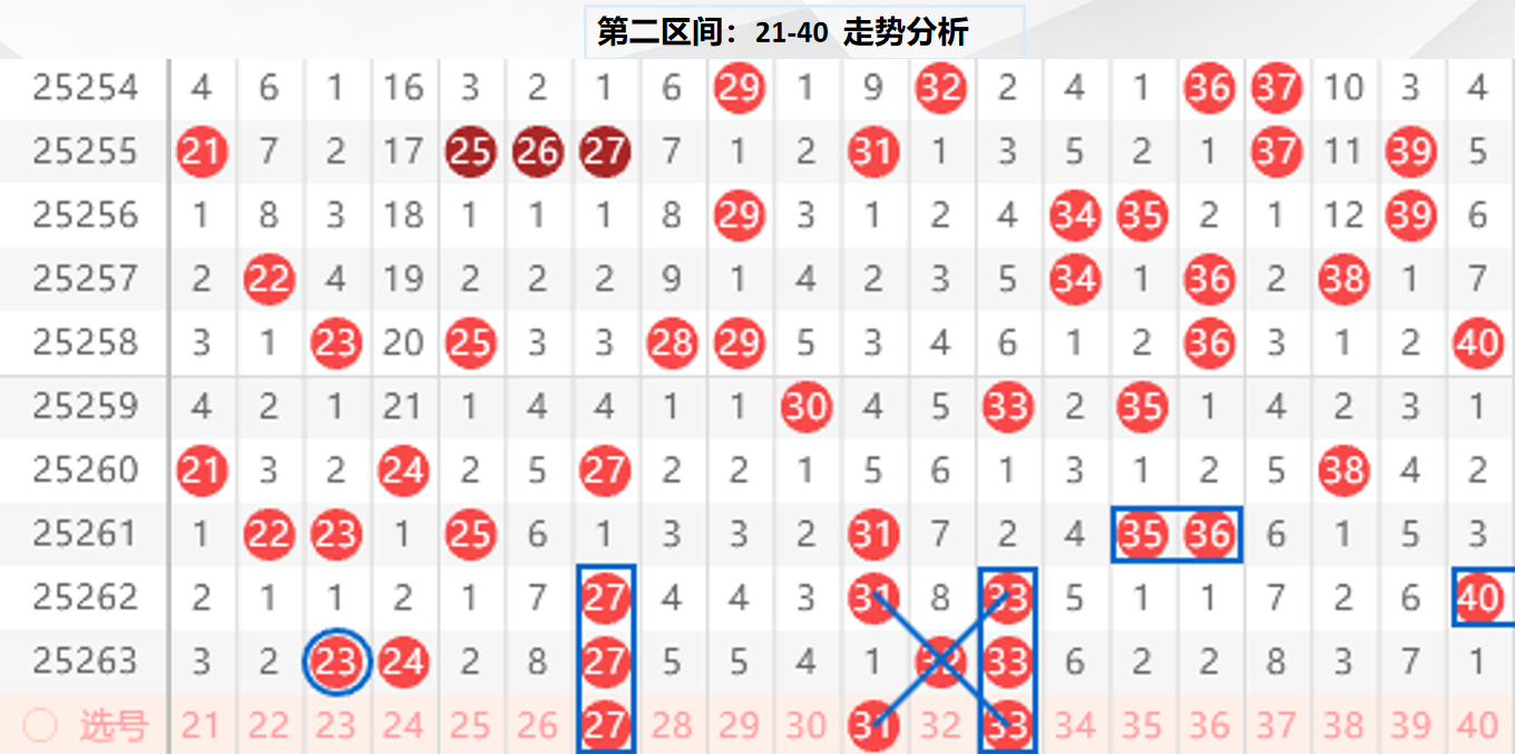 二区分析:【21-40】(走势图标注号码非小黄车大底,请谨慎参考,具体思路将在直播间分享讨论)