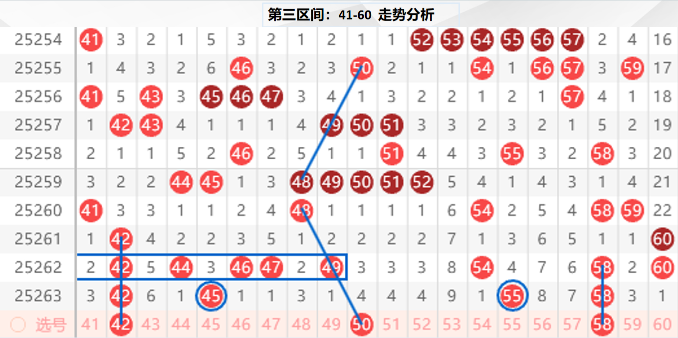 三区分析:【41-60】(走势图标注号码非小黄车大底,请谨慎参考,具体思路将在直播间分享讨论)