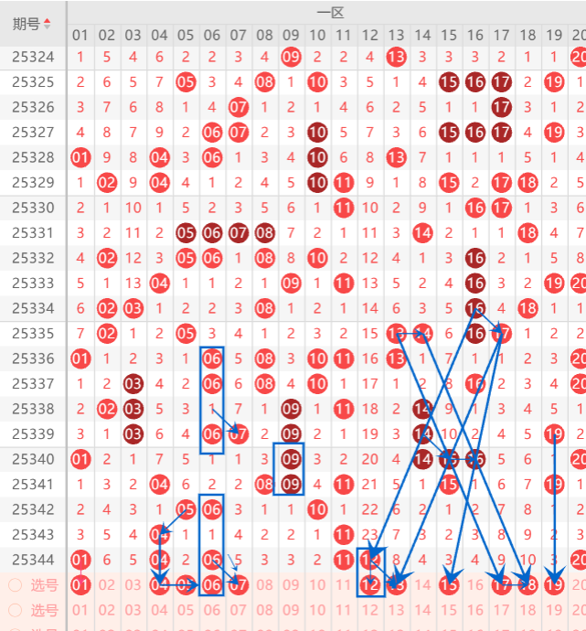 一区在近期的走势分析,近期一区间有走热形态,上期一区间开出了6码,而且上期区间开出的形态是对称形态和重码走势,上期小妹在文中布局到了2码开出,那么本期一区间重点关注的形态是重码走势,空位回补,斜连号走势,那么本期的重码走势上注意01.06.04.12.20中布局2-3码走重机会,而空位回补上注意17.18.19中布局1-2码回补机会,至于斜连号下拉位置上注意防守13开出机会,切记防守即可,上期重点关注空位回补上开出了1码,那么本期重点关注在重码走势选择一码订胆机会,如图所示。
