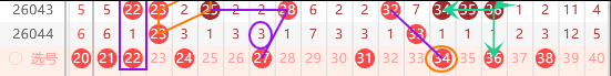 该区间落码数走出冷态,两码下落布局构建整体组合布局;本期可关注该区间4-6码下落回补;那么区域横连点位上可关注一码回补落位;且该区间遗漏三期号码分布偏多,那么24 26 27 30 31 38这几个点位上我们可以考虑二至三码下落回补。走势选择上偏向2字头落位点位。如斜连24或是热态的27落位点,都有回补的可能性;温态码在该区间有21 29 40这三码也可考虑一码回补,按这样构建,那么该区间在号码选择上还是比较好做布局点;