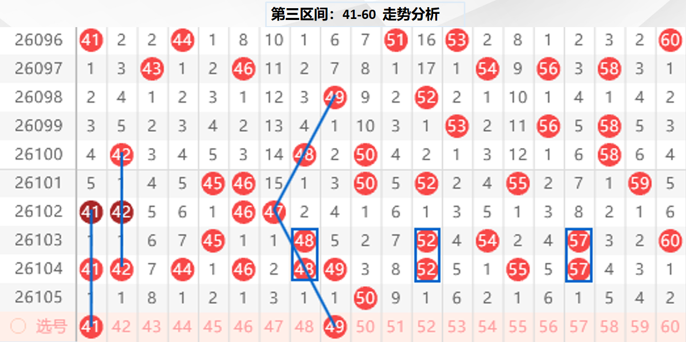 三区分析:【41-60】(走势图标注号码非小黄车大底,请谨慎参考,具体思路将在直播间分享讨论)