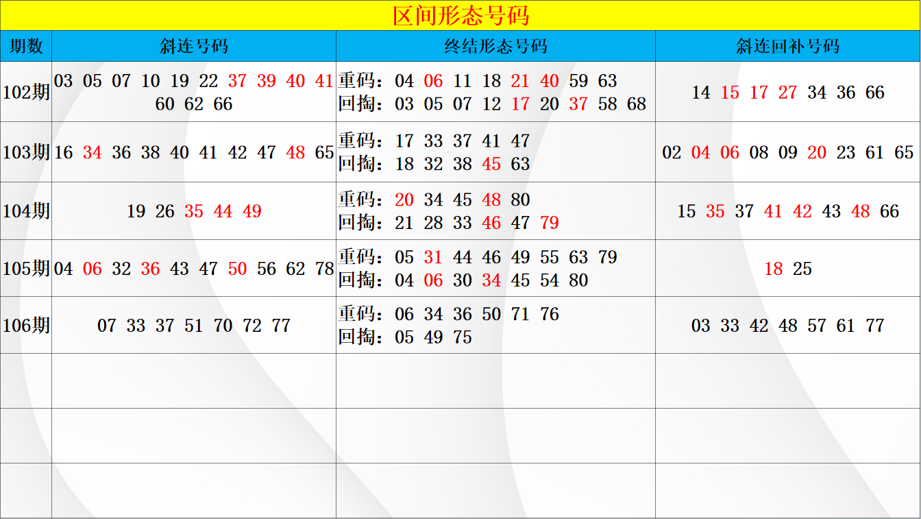 上期四区的开号中复制孤码形态出号,空位中的三个孤码全都开出形态,且空位中也是有小周期的回补号码开出。从区间做形态上的判断重点,重码的接力位置上依然是要考虑对应位置上的选择重点,其中在近期的跳空形态上都是以放空的表现形式出现,67的下方可选择放空形态,且孤码对孤码的倒置上也是没有三重码的开出,所以在区间的重码形态上布局很局限,72 76 77三码中注意择一的布局选择,注意同尾上的出号。从区间做空位中的判断重点,小周期号码依然是要首先关注的回补对应,号码中在61 63 64 79 80五码中选择,对应形态放空的回补中五码都是有机会出现,复制形态做回补中优先考虑64 79 80三码中的开出机会。而在温冷中区间表现上也是接力开号,61 65 66 69 73 74六码中在结合形态和空位中的回补对应位置上可侧重62 65 69 73四码中的判断择一,接力周期开号的机会上还是非常大的。