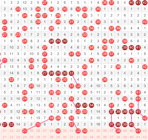 第二区间首先看一码24的三斜连有机会下落,再看29的隔期回补有机会可做,然后32  33可以二选一出一个有机会,尾部看好一码38的重码或者边码41的下落有机会,该区间可推荐的选二搭配组合有29  39或者 32  38.第二区间胆码主看29  32  38