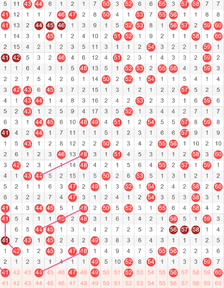第三区间首先看一码龙头位置的41号码球有机会下落,然后看44的跟随形态可以做一手有机会下落,然后防守一码47的下落,再看49的重码以及52的重码可以二选一出一个有机会,尾部看好一码56的回补,防守60的7期值下落有机会。该区间可推荐的选二搭配组合有41  44或者52  56.第三区间胆码主看41  44  47  56