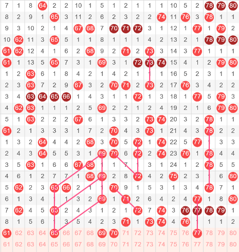 第四区间首先看一码龙头位置的61号码球有机会i下落,再看65的第三期斜连形态有机会i下落,然后69  70二选一出一个有机会,尾部看好一码77的隔期回补,然后防守一码79 。该区间可推荐的选二搭配组合有61  65或者 01  77.第四区间胆码主看61  65  70  77