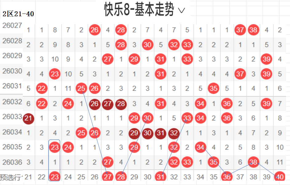 二区(21-40):遗漏5期以下有18,027 32 33 35 38  5,数据所示,冷码平均,选择条件增多了.上期开出了5个号码,出码比较分散.这期布防相应增加,重码按比例落这区较少,先给出关联码40,这个区间间接走势,温区,21-30区间上期开了1个,依旧不是重点选号区间,31-40区间开出4个,本期关注热码的回补,间隔小遗漏值最佳,3字头转热,这个小区热码注意回调,可以做关联码的布局,注重温冷码的回补.