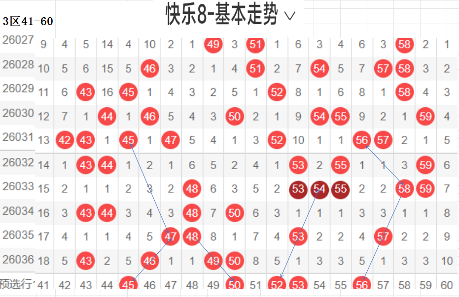 三区(41-60):遗漏5期以下有17,043 46 49 50  4,温开方式,这区码数有回暖之意,可以防一手,先定胆码走势较大者,隔期,斜三连,分边号码,可重防,间隔5以上号码可以随走势选取,例如本期大冷码,走势比较大,可以做胆,通常联动可带出,分边对称的号码,本区间也有很大走势.可关注下.隐形夹角号码.做补位形态号码.都需要观察动态走势.以上是本区间的选码方法.