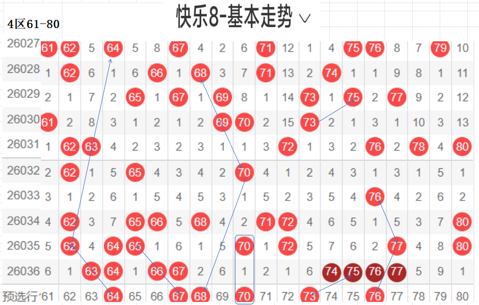 四区:(61-80):遗漏5(5)以下有16,063 64 66 67 74 75 76 77  8,平均温开方式,上期开出8,区间回暖,后区可防,区间从以往数据来看,重码很强,一枝独秀的存在,近期有回补走热的趋势,区间回暖,本区间后区可防,与一区相比,也是温区.,对称下落,隔期回补码,可以防,这区对呈对称三角关系的胆码,斜三连有走势的胆码,联动落位码,都有各自的走向落位关系,根据走势选择一种方式选码.
