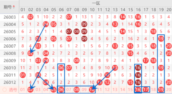 该区间的02号数字我们注意一下出号情况,属于三斜连号码,出号机会是有的。本期的05号数字也是属于三斜连号码,出号机会也是有的,我们可以防守一下05 08号数字同出的情况。本期的10号数字是属于斜四连号码,出号机会也是有的,可以防守一下08 10号数字同出的情况。本期的16号数字我们防守一下走四重的情况,本期的17 18号数字也是有机会出一个号码的,所以本期这里我们可以防守一下16 17号数字或者16 18号数字同出的情况。