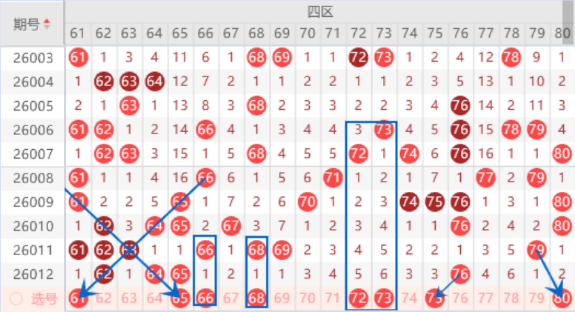 该区间的61 65号数字是属于交叉号码,出号机会是有的,我们可以防守一下同出的情况。连号空一带号66 68 69号数字本期不一定会出号码,我们做一下防守就行了,其中的66 68号数字可以防守一下出一个号码的情况。本期的70 71 72 73号数字我们要注意落下号码的情况,其中的72 73号数字可以重点关注一下出号情况。上期开出了76号数字,本期我们注意一下走分边的情况,所以本期的75 77号数字我们要注意出一个号码的情况。
