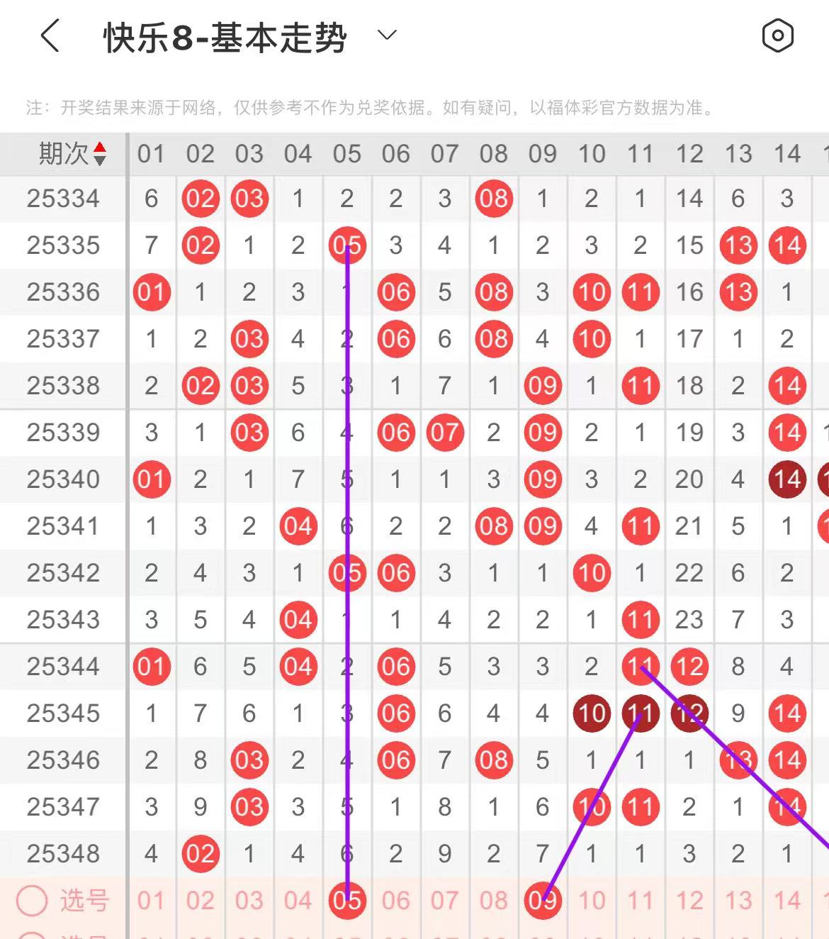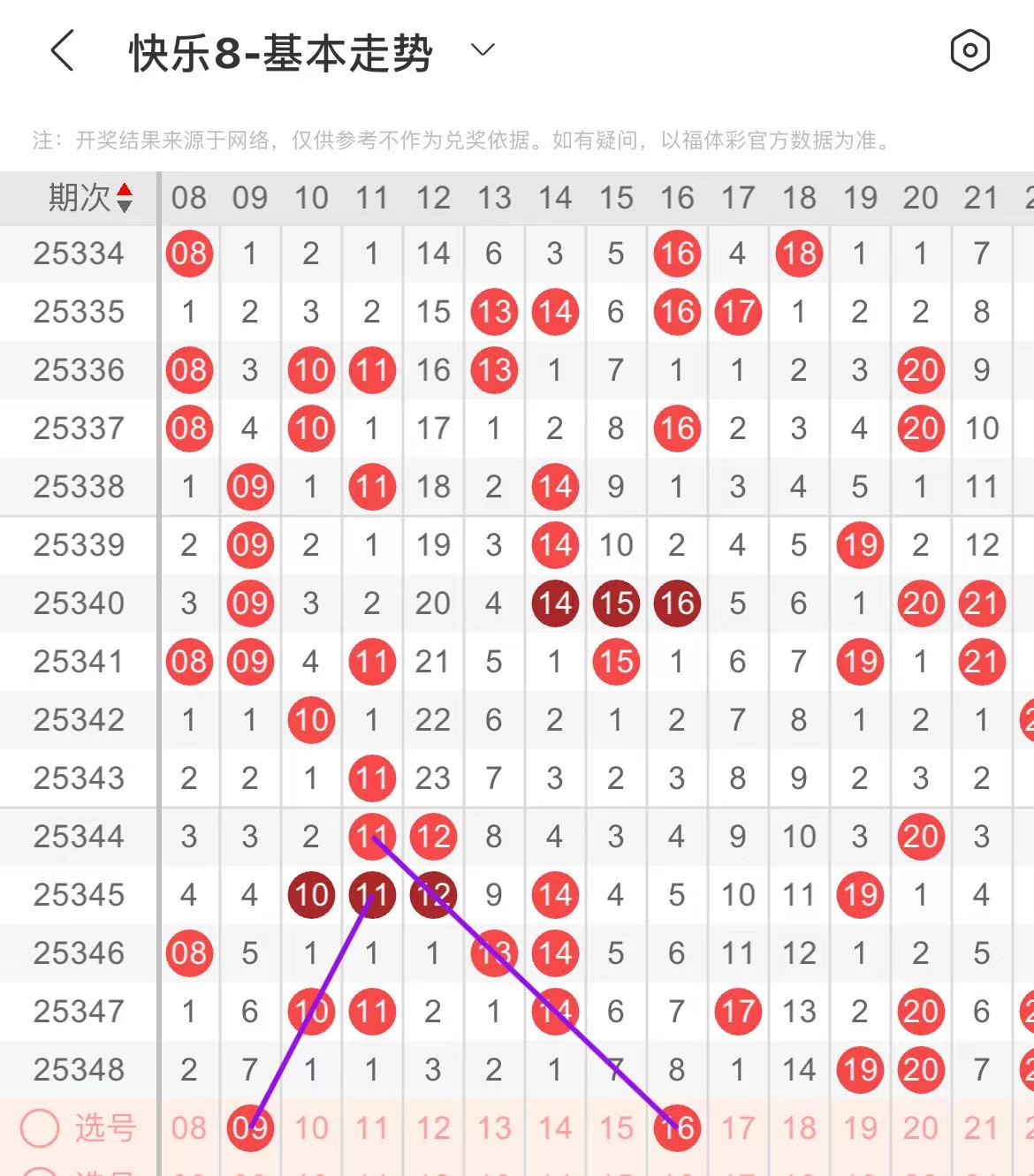 11-20区:本区间上期开出了两个号码,从号码走势图上看,本期可参考的号码走势甚少,有断区的可能,在选号上建议以防为主,本期需要防范的号码有16号,假斜连出号走势。