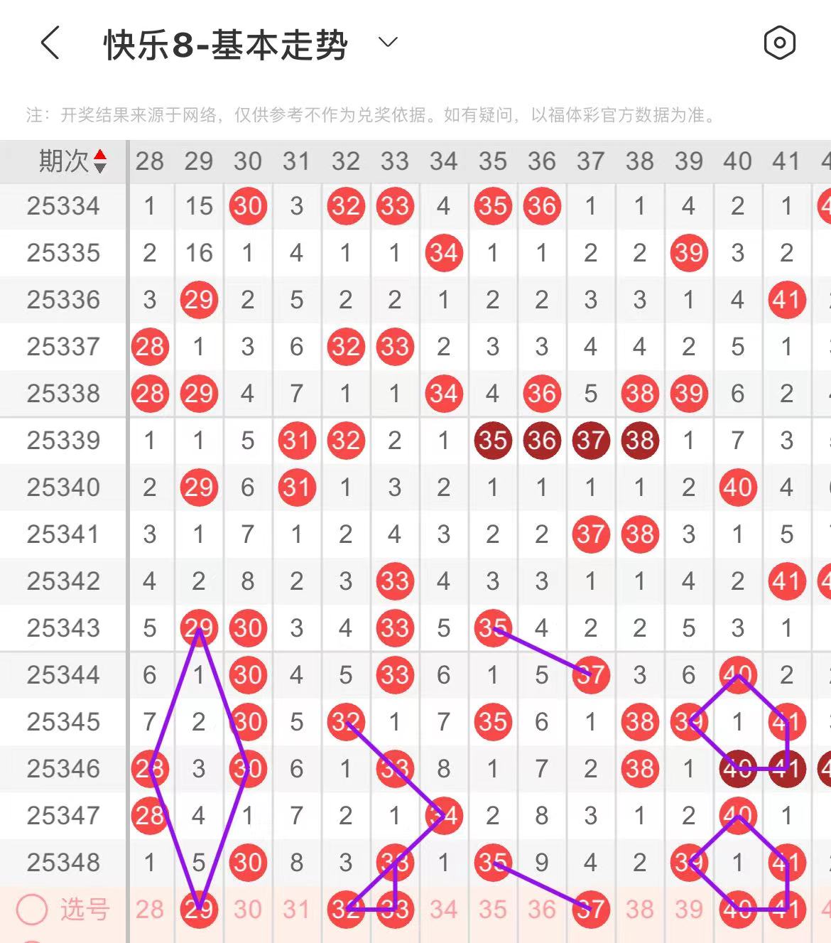 31-40区:本区间上期开出了三个号码,从号码走势图上看,该区跟2头区一样属于温热区,出号个数在三个号码左右,在选号上可考虑多做选择。有出号走势的号码有32号,回首掏斜连出号走势,防32.33同出,37号,35对应37出号走势,40号,形成一个梅花号走势形态。