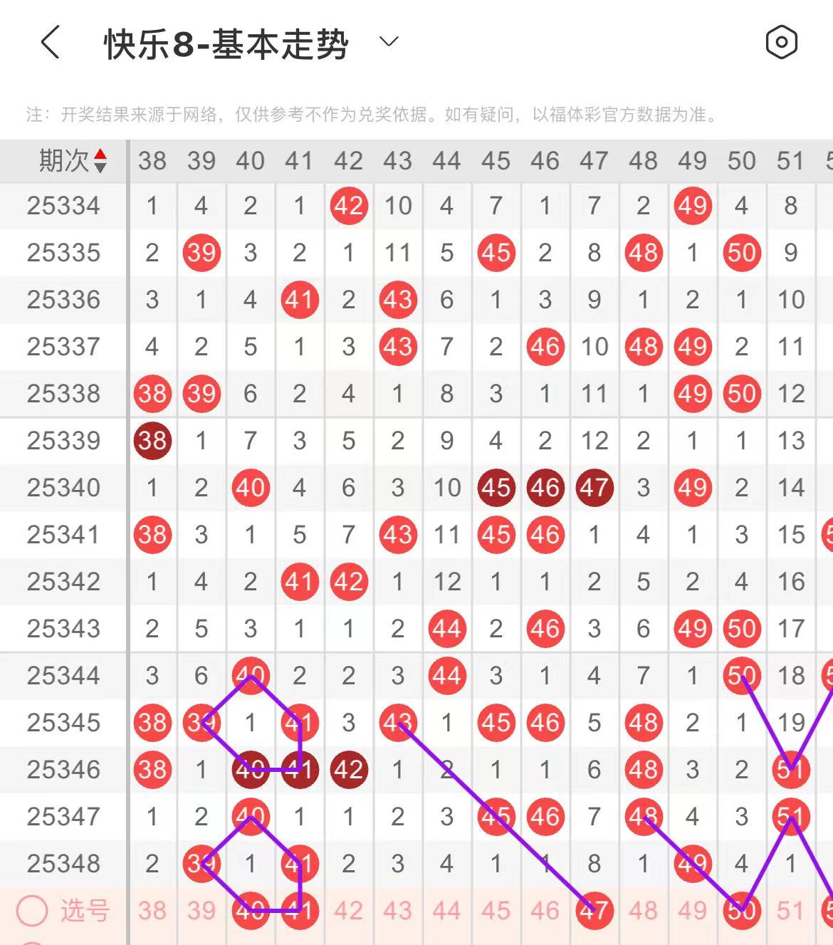 41-50区:本区间上期开出了两个号码,从号码走势图上看,本期关注重号以及形态号码开出,出号个数在三个号码左右,有出号走势的号码有41号,走重,形成一个小三角出号走势,47.50号,均有斜连出号走势。
