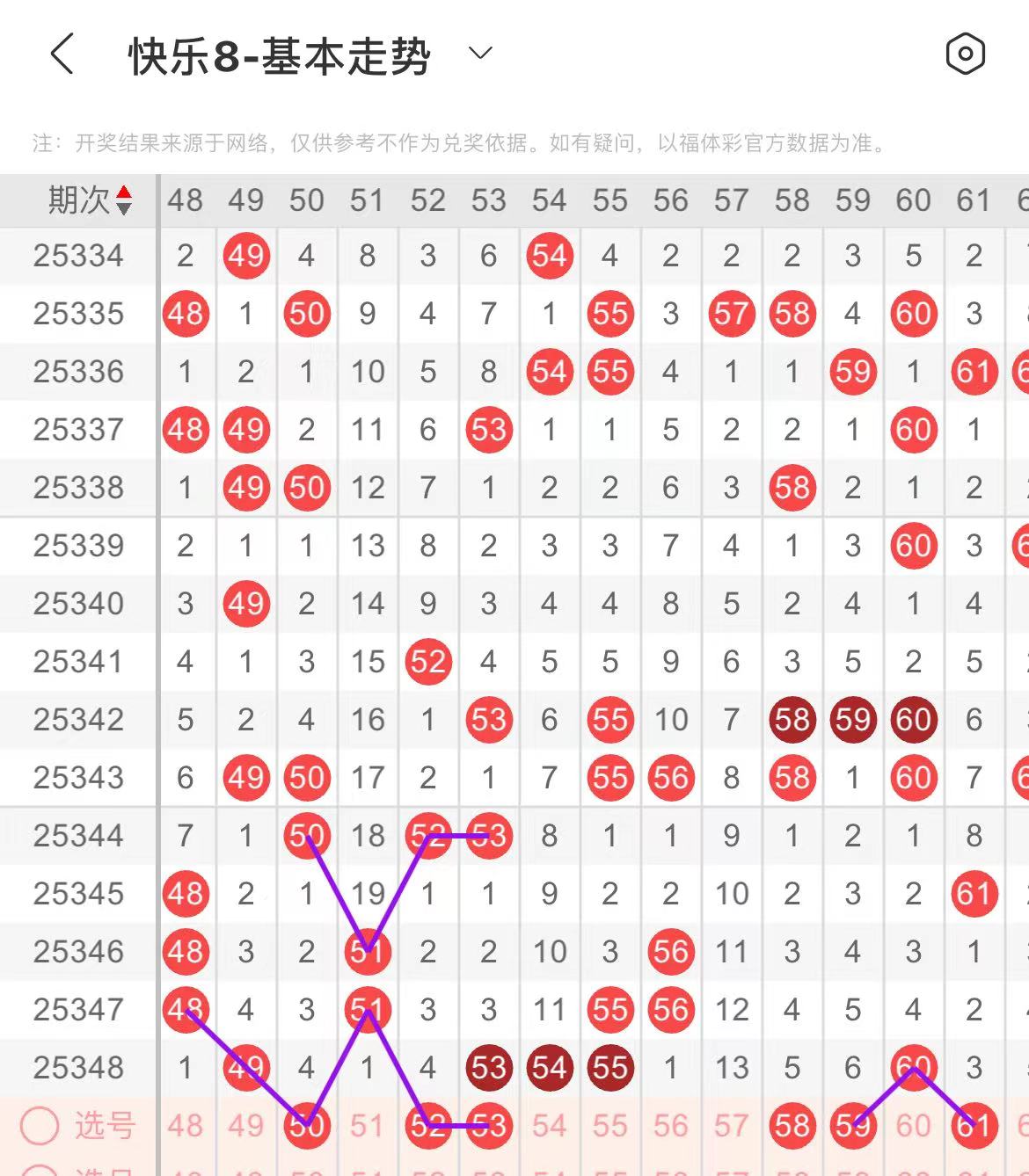 51-60区:本区间上期开出了四个号码,从号码走势图上看,该区出号个数有一定的规律性,出号个数在三个号码或以上,在选号上可考虑多做选择。有出号走势的号码有52.53号,同出,形成一个小三角出号走势,59号,做为边号开出,防58.59同出。