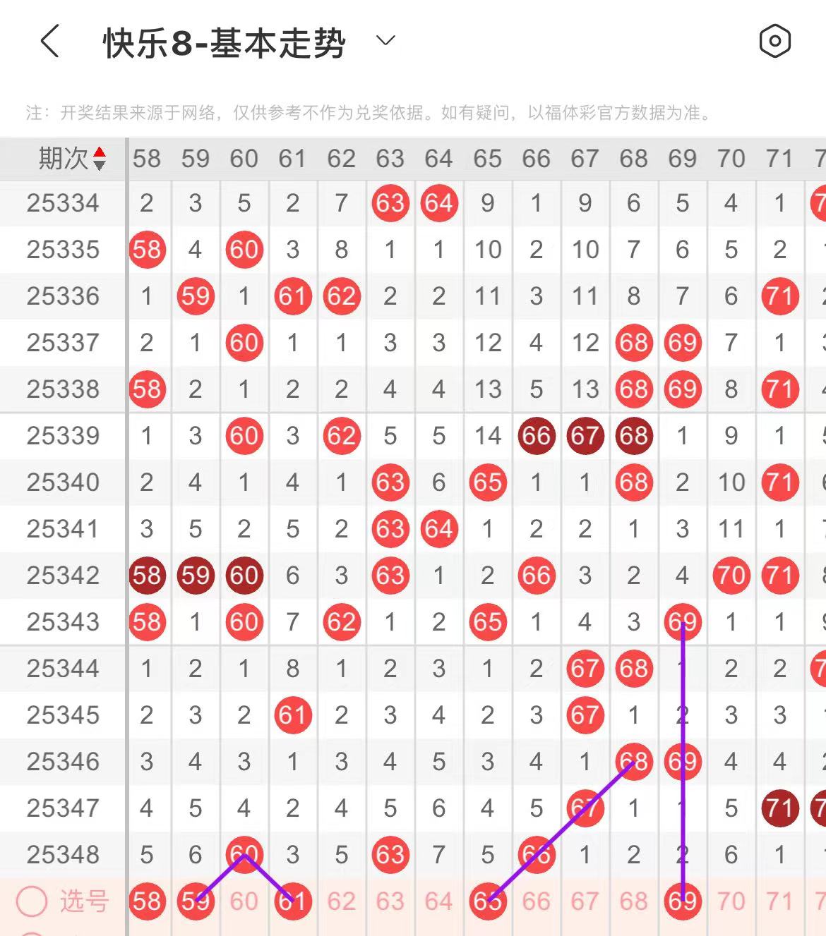 61-70区:本区间上期开出了两个号码,从号码走势图上看,该区现属于温号区,出号个数在两个号码左右。有出号走势的号码有61号,做为边号开出,65号,斜连出号走势,69号,隔期相同出号走势。
