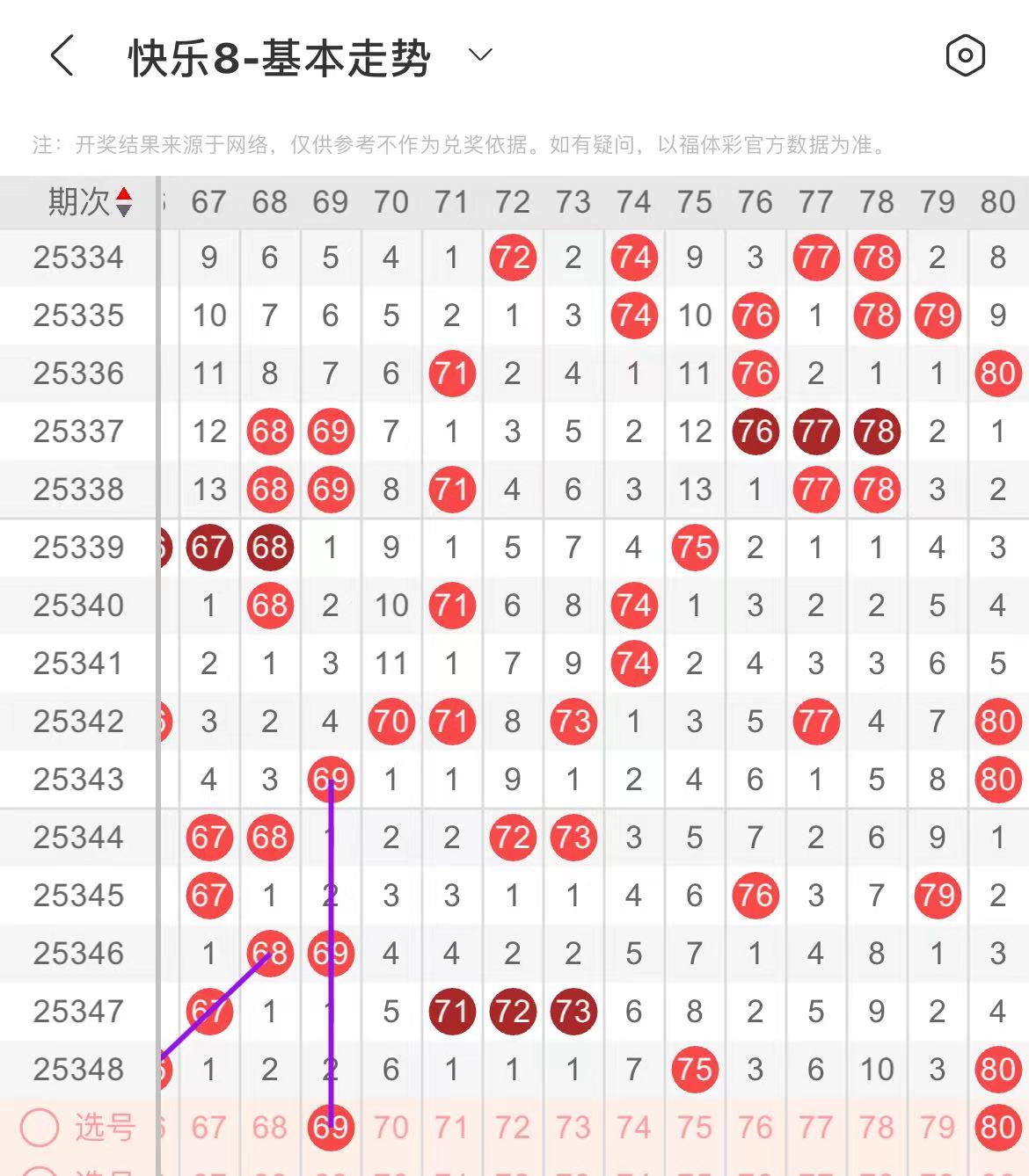 71-80区:本区间上期开出了两个号码,从号码走势图上看,该区现属于冷号区,在选号上建议以防为主,出号个数在一两个号码左右。有出号走势的号码有80号,走重的可能。
