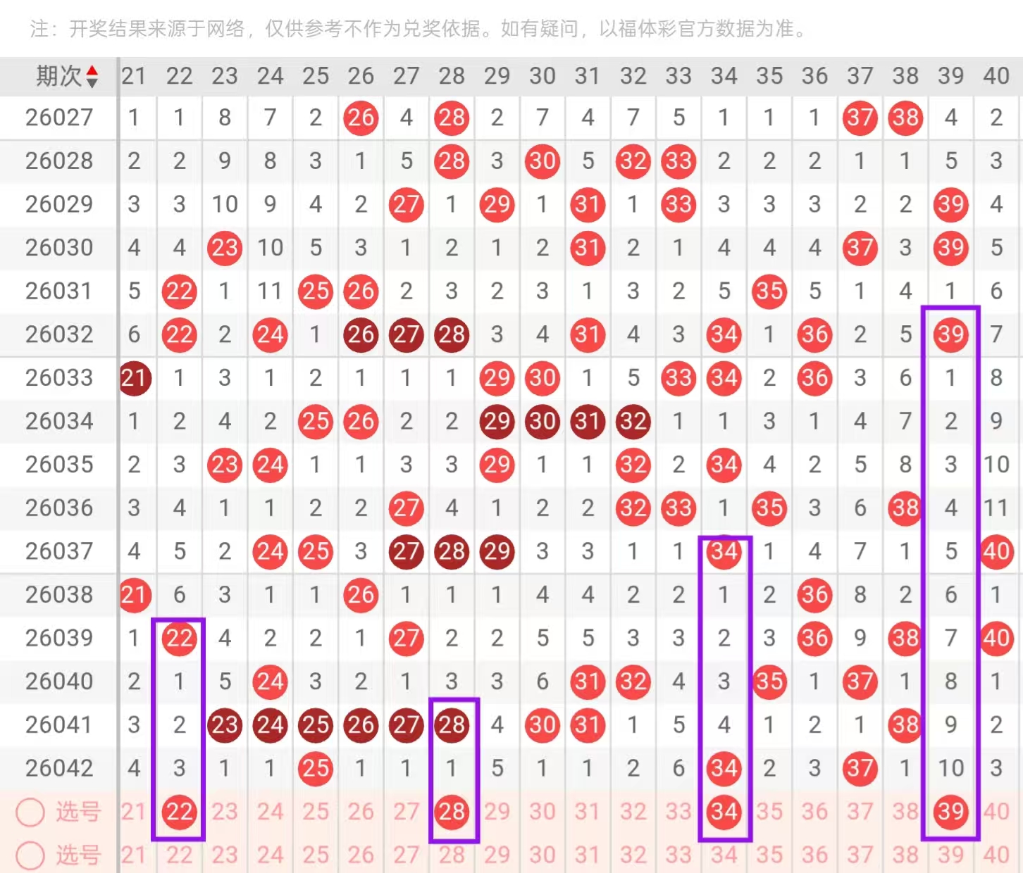 二区21-40:二区间,上一期回补了三个号码的下落,从近期二区间号码下落点位来看,呈现出了由热转冷的形态,今天我们要重点关注的是二区间空缺位置的回补和对子,下面的一个回补点位在二头,首先我们要重点关注的是21-22的一个下落点位和27-28的一个回补点位,这里要重点关注的是21-27和22-28的一个搭配下落,回到三头位置,今天这里要重点关注的是34-37同开同码的一个回补点位,和39-40的一个下落点位,今天这里可用34-39和37-40的一个搭配下落。