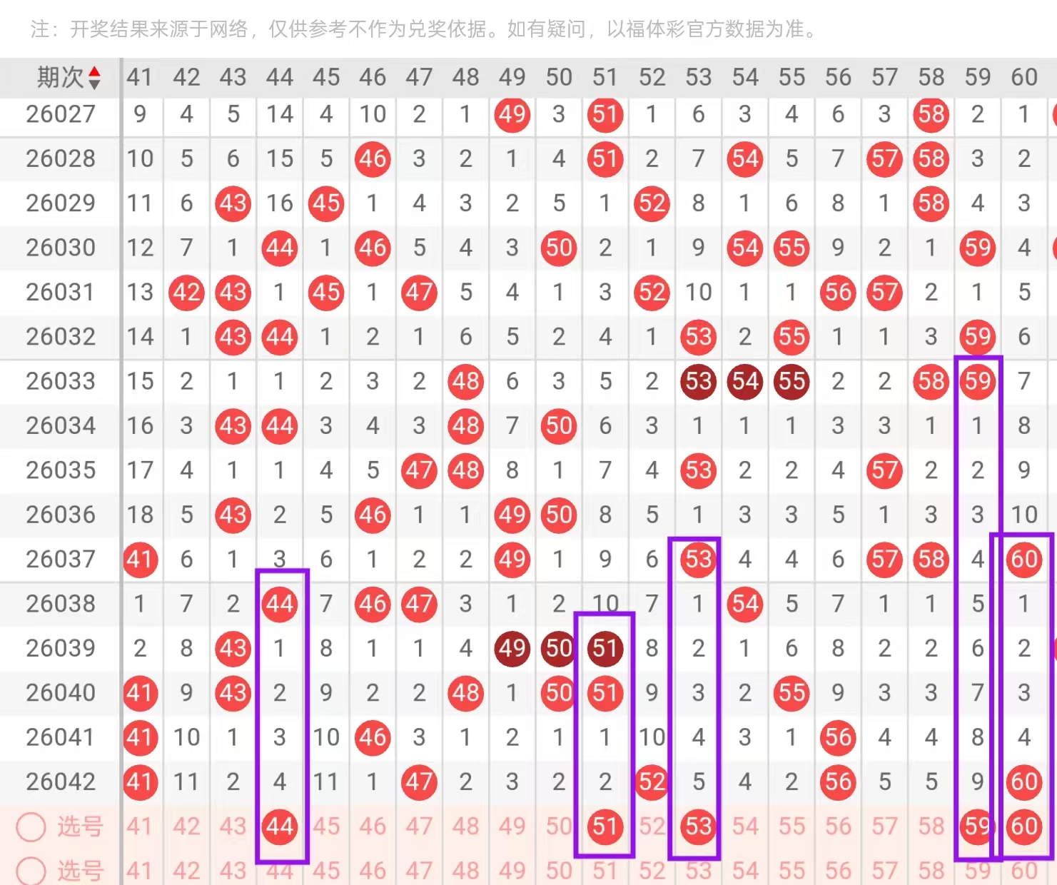 三区41-60:三区间,上一期回补了5个号码的下落,从近期三七间号码下落点位来看,呈现出了由冷转热的形态,今天我们要重点关注的是三区间空缺位置的回补,在四头首先我们要重点关注的是42-45的一个回补点位和5头位置,51-53的一个回补点位,今天这里可用42-51和44-53的一个搭配下落,回到五头中部位置,这里值得我们重点关注的是57-58的一个下落点位,和59-60的一个回补点位,这里可用57-60和58-60的一个搭配下落,这里值得我们重点关注的是开出对子下落的可能。