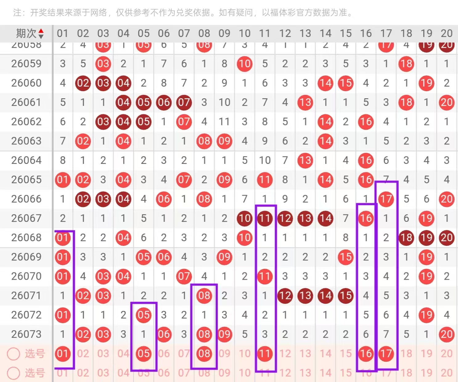 一区01-20:一区间,上一期回补了6个号码的下落,从近期一区间号码下落点位来看,呈现出了由冷转热的形态,今天我们要重点关注的是一区间空缺位置的下落和重码的一个回补,在0头首先我们要重点关注的是02-08同开重码的一个下落点位,和01-11的一个回补点位,今天这里可用01-08的搭配和02-11的搭配回补回到一头位置,这里值得我们重点关注的是16-17的一个回补点位和19-20的一个下落点位,今天这里可用16-19和17-20的一个搭配回补,在这里值得我们重点关注的是开出对子回补的可能。