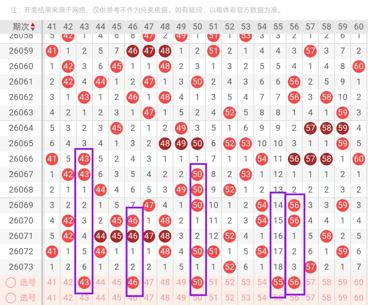 三区41-60:三区间,上一期回补了两个号码的下落,从近期三区间号码下落点位来看,呈现出了由热转冷的形态,今天我们要重点关注的是三区间空缺位置的下落和对子下面的回补,在4头首先我们要重点关注的是是43-44的一个回补点位,和50-51的一个下落点位,今天这里可用43-50和44-51的一个搭配回补回到五头位置,这里要重点关注的是53-55的一个下落点位和58-60的一个回补点位,今天这里我们要关注的是53-56的搭配,和55-60的一个搭配回补。