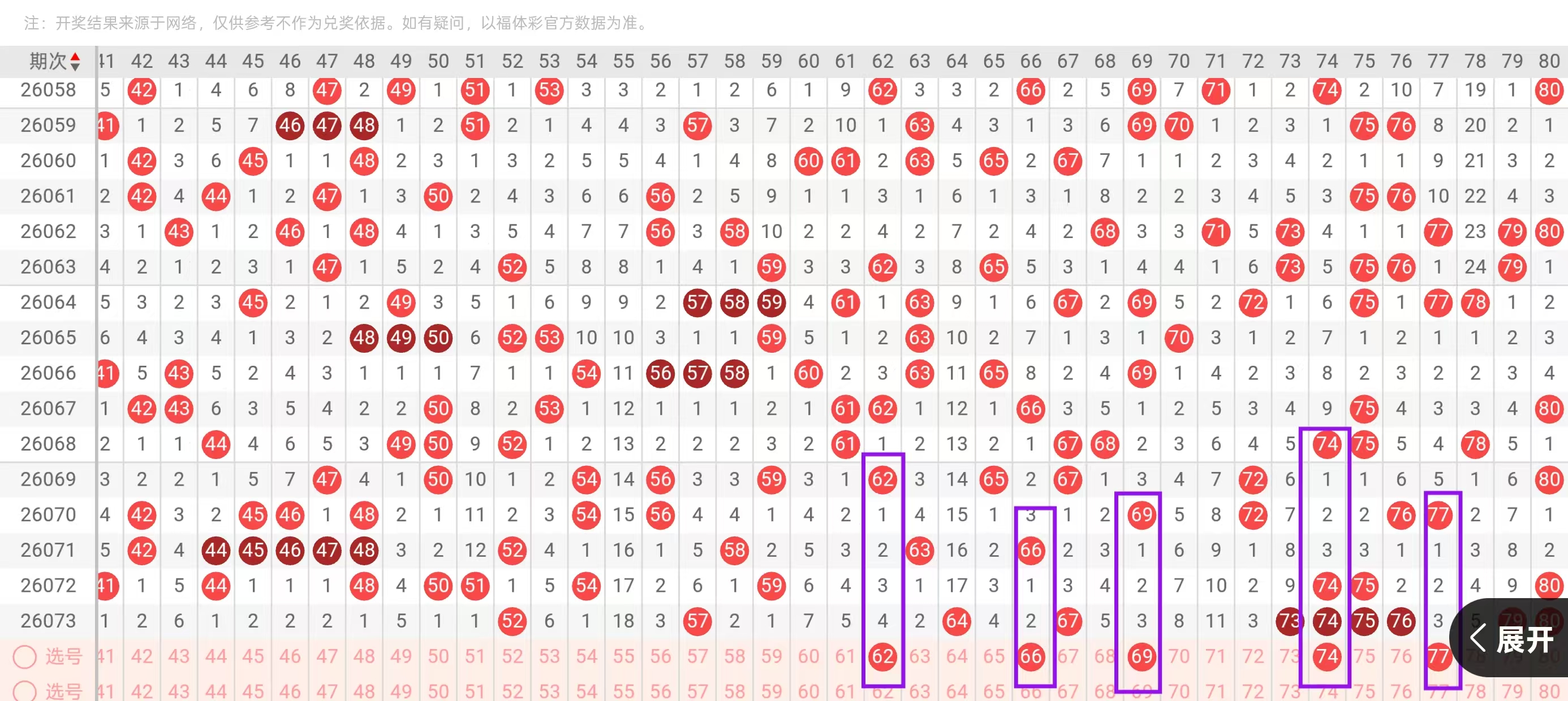 四区61-80:四区间,上一期出现了大面积的回补,总体回补了8个号码的下落,从近期四区间号码下落点位来看,呈现出了由冷转热的形态,今天我们要重点关注的是四区空缺位置的下落和重码的一个回补,在六头首先我们要重点关注的是62-65的一个回补点位,和66-69的一个下落点位,今天这里可用62-66的搭配和65-69的一个搭配回补回到7头位置,这里值得我们重点关注的是74-80同开重码的一个下落点位,今天这里可用74-77和78-80的一个搭配回补。