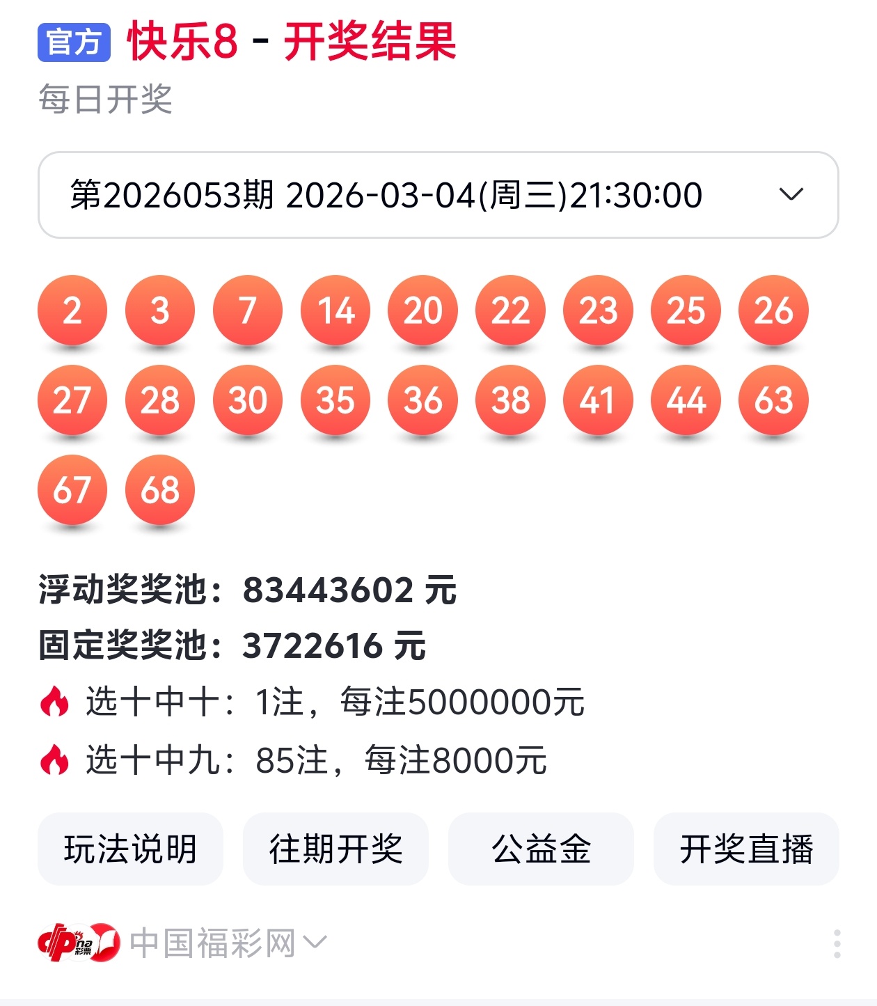26053期命中9码 02,03,14,22,25,35,36,38,68