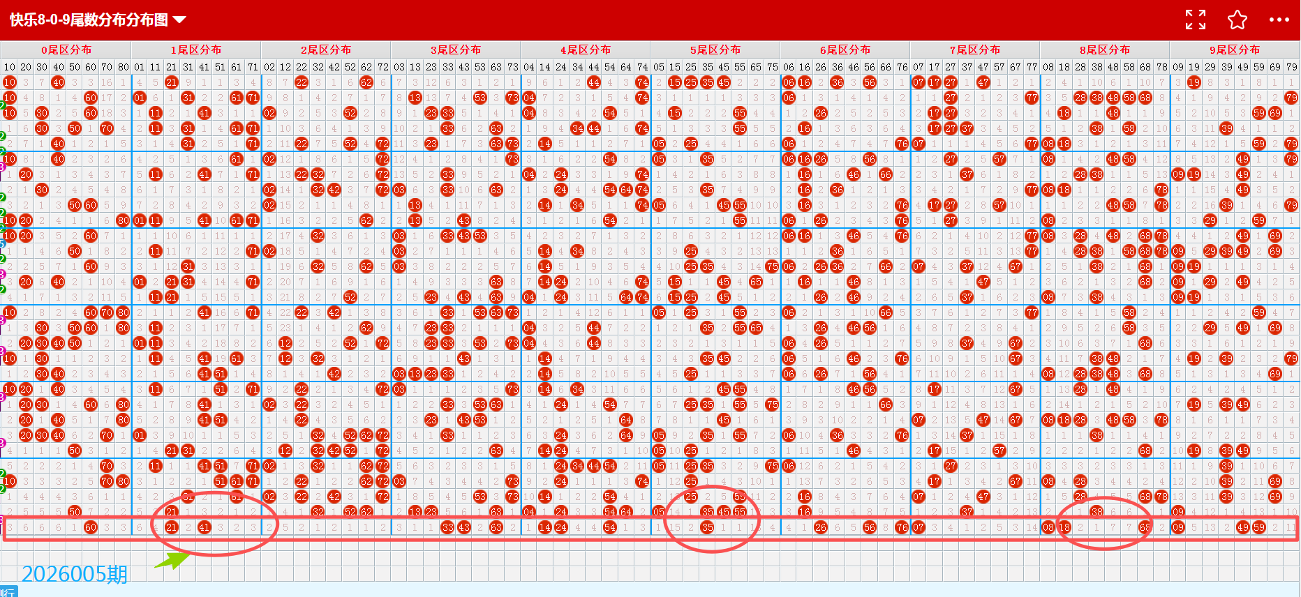 上图是快乐八2026005期的尾码走势图,从图中看0尾到9尾出号个数依次是:0尾号码区开出1个;1尾号码区开出2个;2尾号码区开出0个;3尾号码区开出3个;4尾号码区开出3个;5尾号码区开出1个;6尾号码区开出3个;7尾号码区开出1个;8尾号码区开出3个;9尾号码区开出3个;再看小尾号码(0尾-4尾)区有9码,大尾号码(5尾-9尾)有11码;数据比对统计后可以看到本期3、4、6、8、9尾出号数量最多,一共开出了15个中奖号码。本期2尾出现断区!由走势比对推断2026006期重点需要关注1、5、8尾区号码下号热度回补和落号数量增加的概率较大。