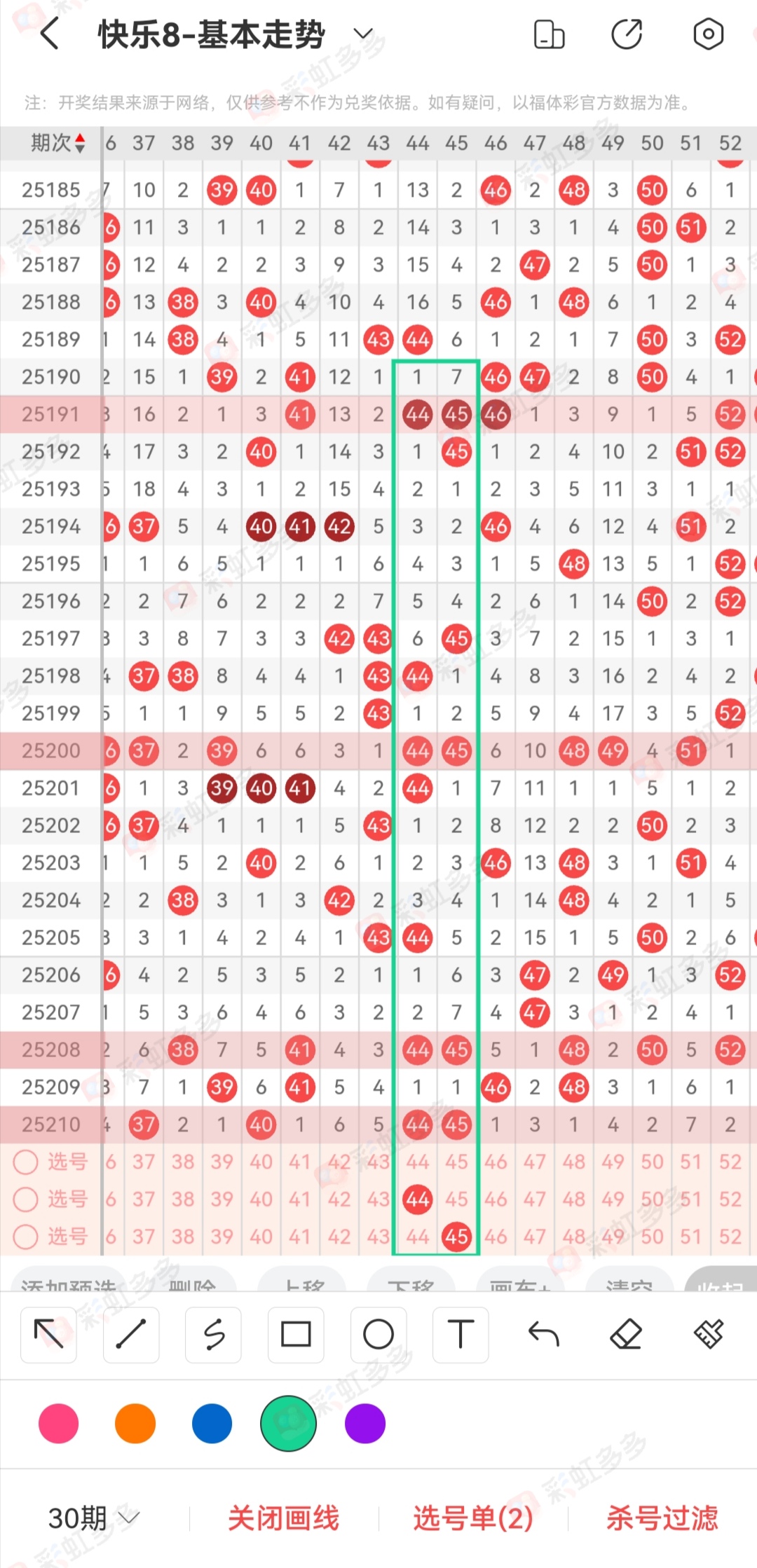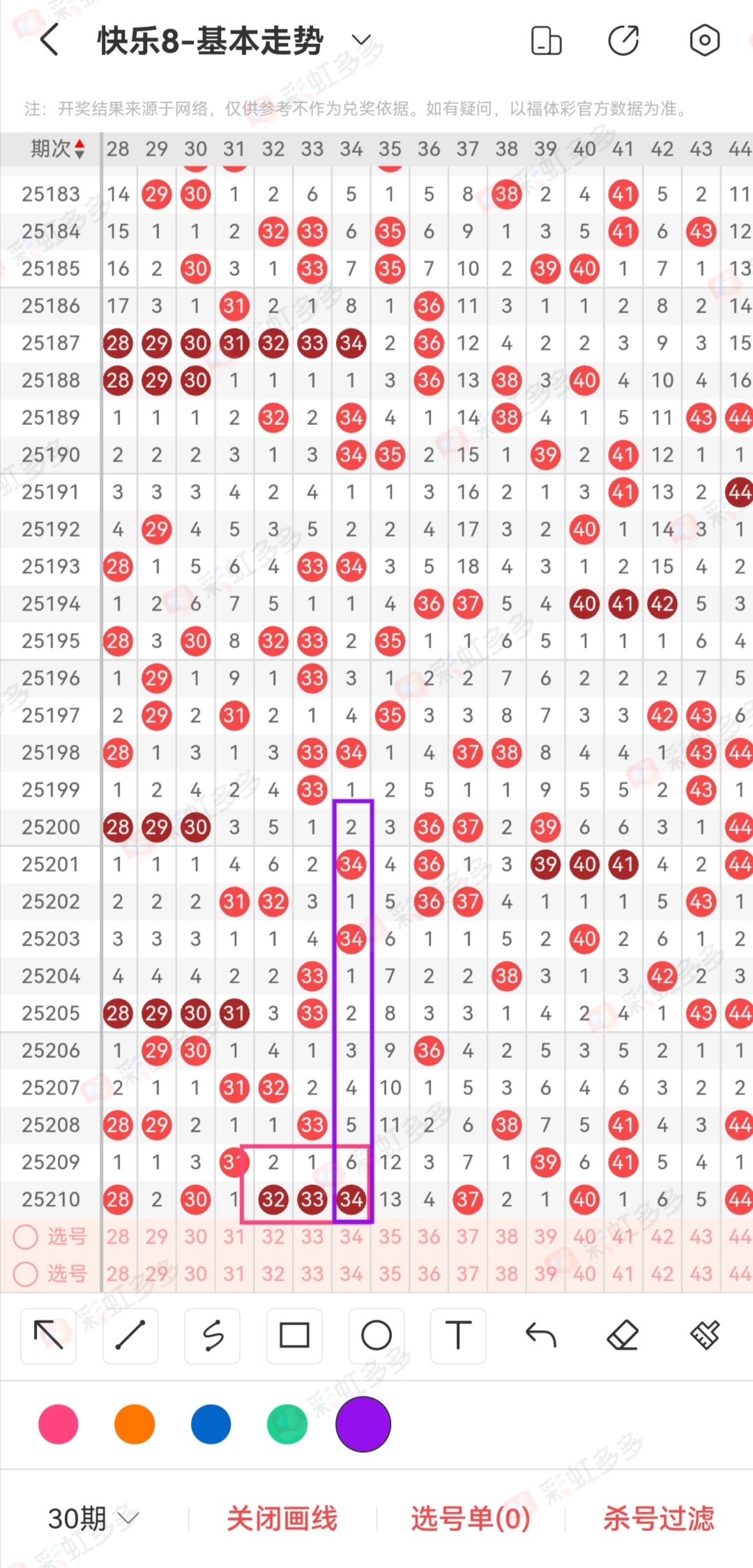 今天分析一下昨天出现的数据变化。最大的改变不是说重号间隔1期就给你开出来。而是存在连号,而且连号最大的特点昨天也给你开出来了。要是能够通过数据总结延伸,知道昨天的会出连号的话,那么大概率是能够有方向去做的。比方说32 33 34这里就是之前的遗漏特点。最亮的区域如果没有记错的话是在之前的7头。昨天类似这样的数据分析存在两个地方。跟打选三,两组4块钱中53。这样的逻辑真的太牛了。所以大家一定要好好看。好好整理一下数据结论。那种当期短时间内的规律不是结论。我要的是那种能够经得起时间,大量数据捶打的那种。可以说这样的数据规律都是真金白银。当然选择连号还会存在别的思路。比方说我们近期出现的6期遗漏4期遗漏表现出顺位的形态。或者我们之前说过的点,20 21对吧。这些都是在大量数据能够延伸的结果。而且在这种类型的3码,也是命中过500倍的。各位努力吧,奖池就在眼前,有能力有运气的拿走。然后我们回到昨天的这里,这个位置在有那么一段时间是走热,现在又出现了第一次,有没有可能说还会再来一次。虽然存在其他逻辑说这里的号码不会出,但是不怕一万就怕万一。打了心里有安排,没有跟打那说什么都没用。今天也会存在数据延伸,大家适当考虑。