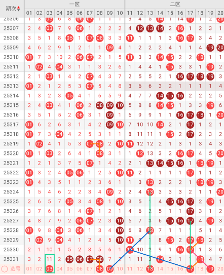 一区开出:05,06,07,08 奇偶比: 2:2 和值:26 跨度:3,上期开出4个号码,奇偶数号码均衡。本期无三斜连走势,隔码斜连走势:09,近10期平均出号2.4枚,本期推荐关注号码:03、08、09。