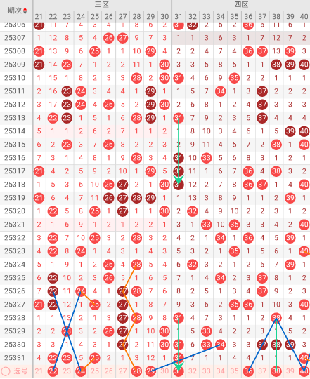 四区开出:31,40 奇偶比: 1:1 和值:71 跨度:9,上期开出2个号码,奇偶数号码均衡。本期无三斜连走势,隔码斜连走势:36 40,近10期平均出号2.4枚。本期推荐关注号码:31、36、38、40。