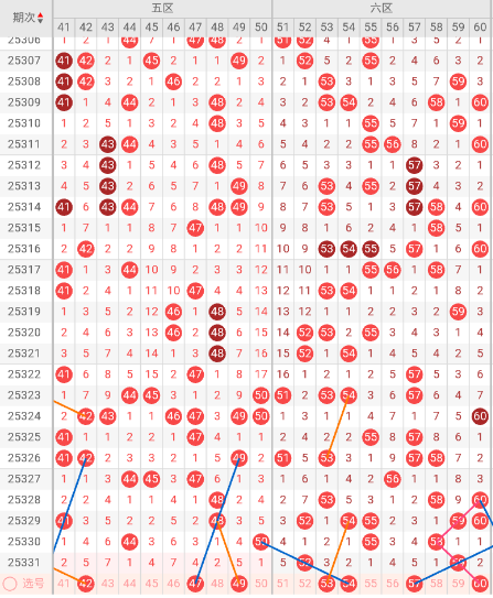五区开出:(未出号),上期开出0个号码,本区空开。本期无三斜连走势,隔码斜连走势:47。近10期平均出2.4枚,本期推荐关注号码:47、49。