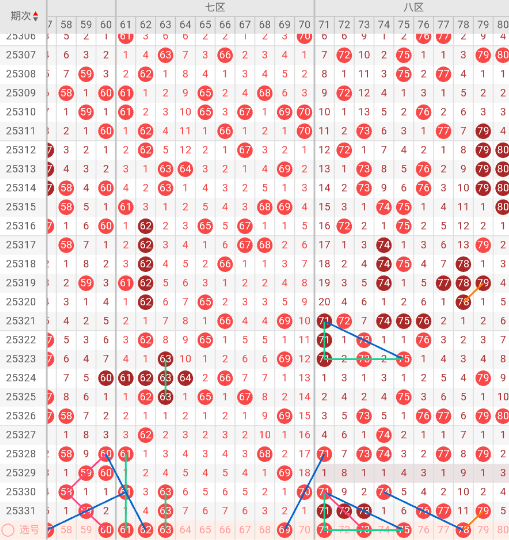 八区开出:71,72,73,76,77,79 奇偶比: 4:2 和值:448 跨度:8,上期开出6个号码,奇数号码占优势。本期三斜连走势:73,隔码斜连走势:75 78。近10期平均出号2.7枚,本期推荐关注号码:71。