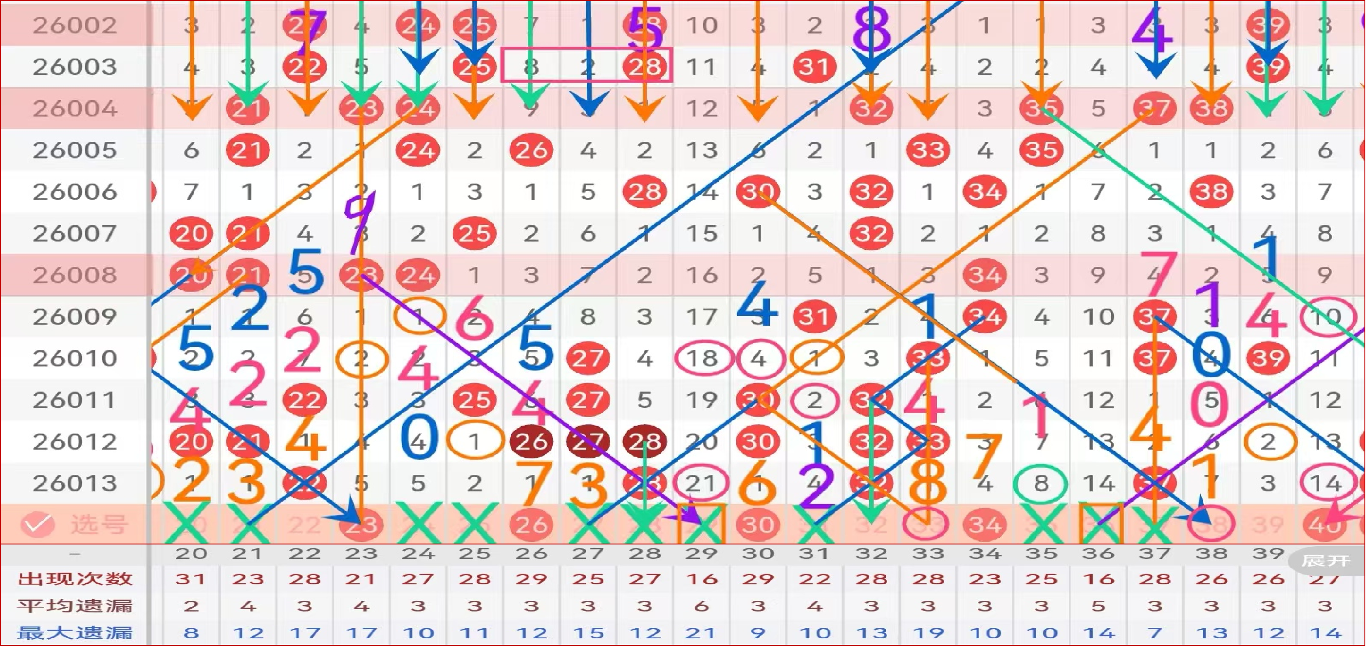 区间推荐主做号码23 26 30 34 40 防守号码22 33 38 39;