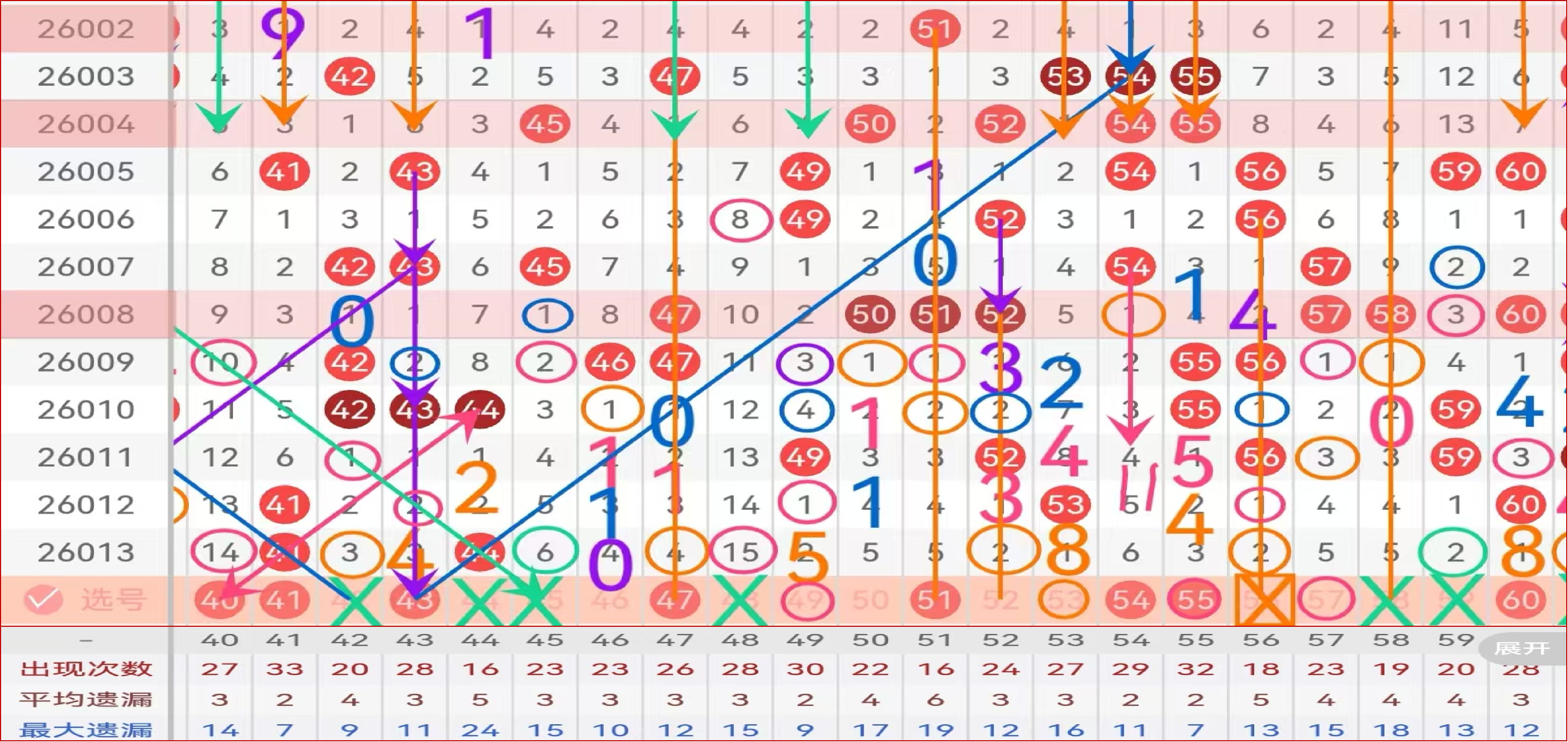区间推荐主做号码41 43 47 51 54 55 60 防守号码46 49 53 57;