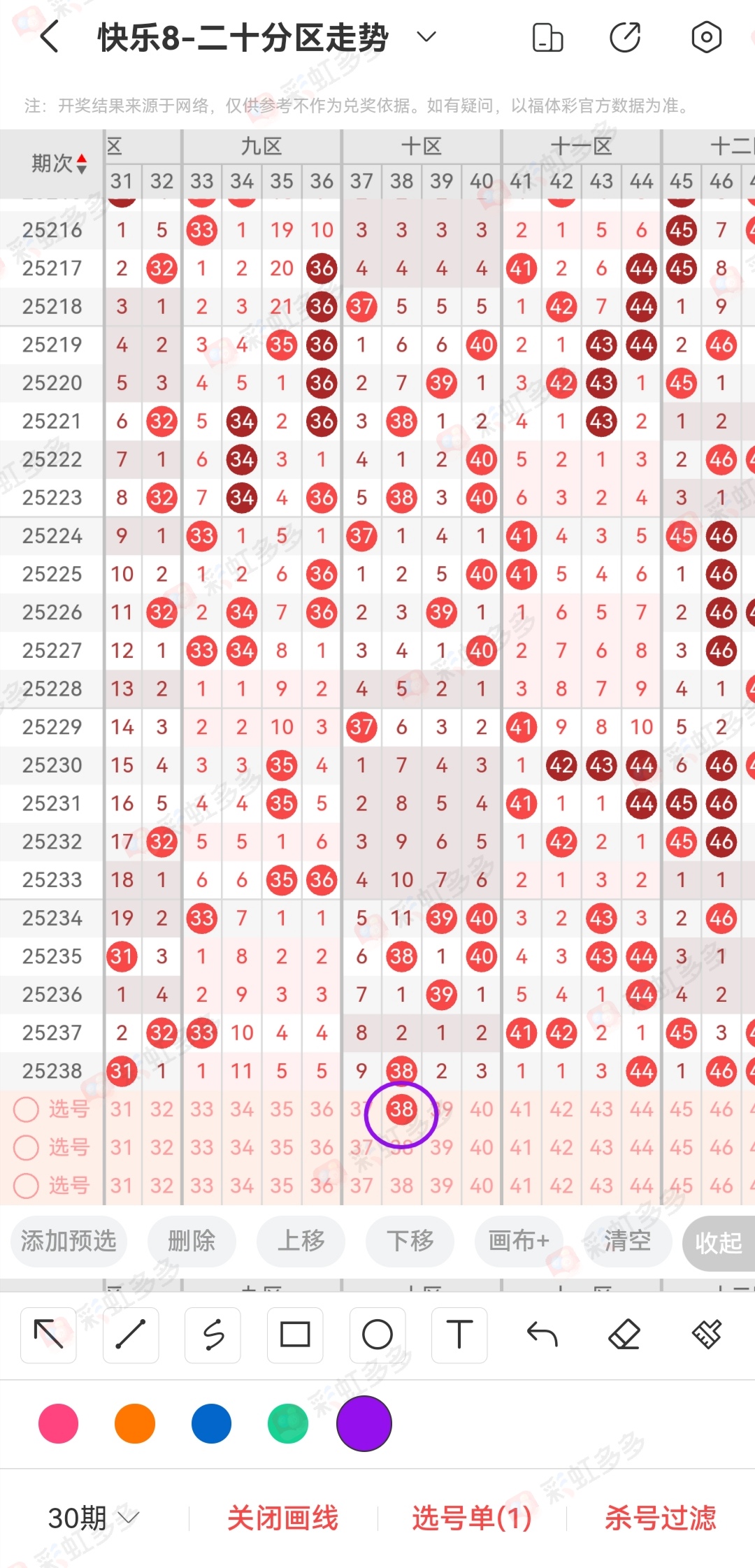 第二张图就是今天的38这个点,大家千万不要在这个号码上面多下功夫。锦上添花也好,画蛇添足也好。看好的直接做,不要去找什么理由。不看好的直接丢。不要怪我告诉你,38在30期里面间隔5期顺位,也不要说我没跟你说有个号码和38的类型一样。千万不要过度解读这个号码。他强任他强,清风拂山岗!