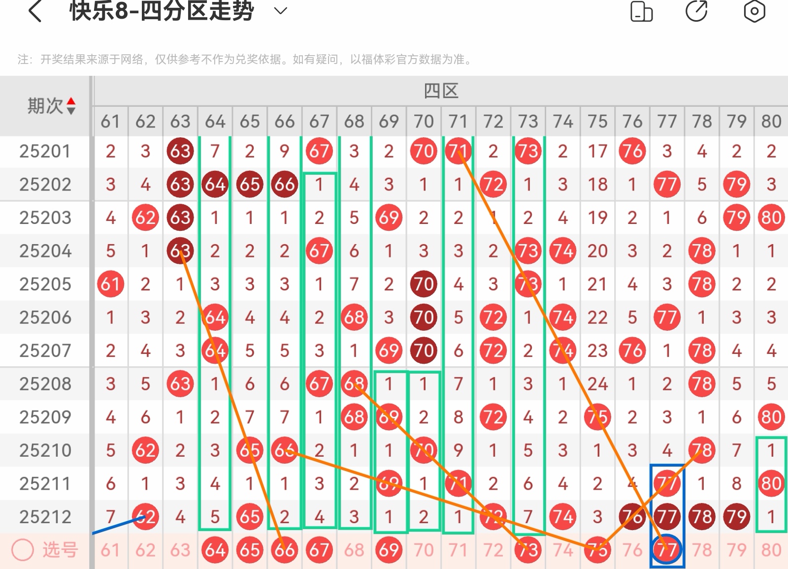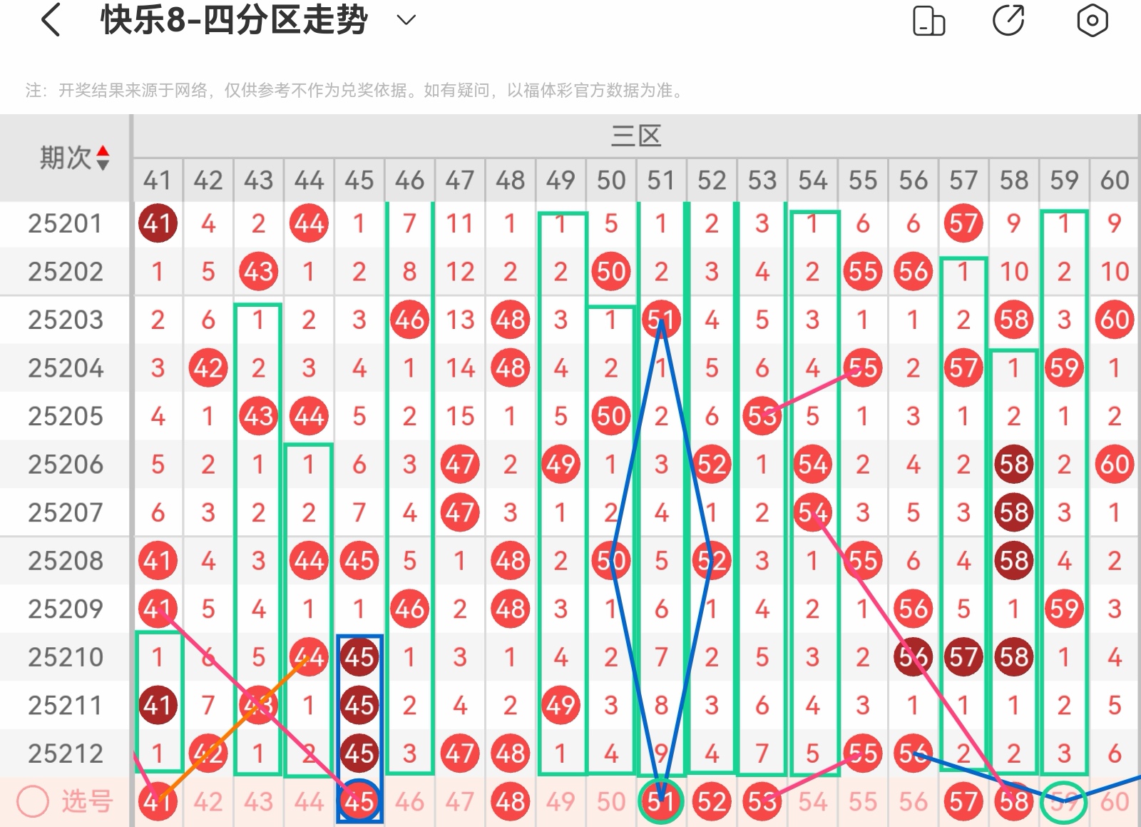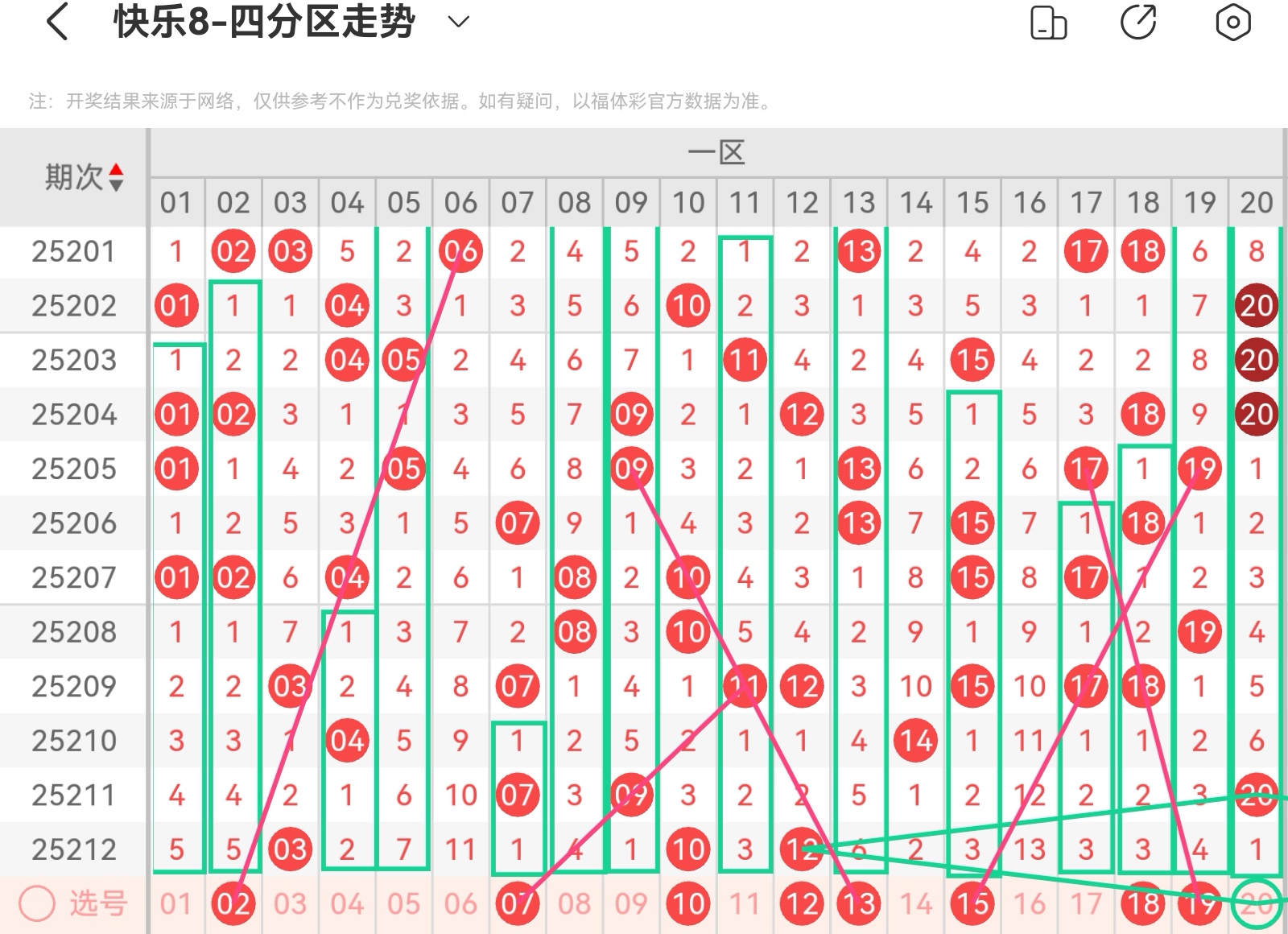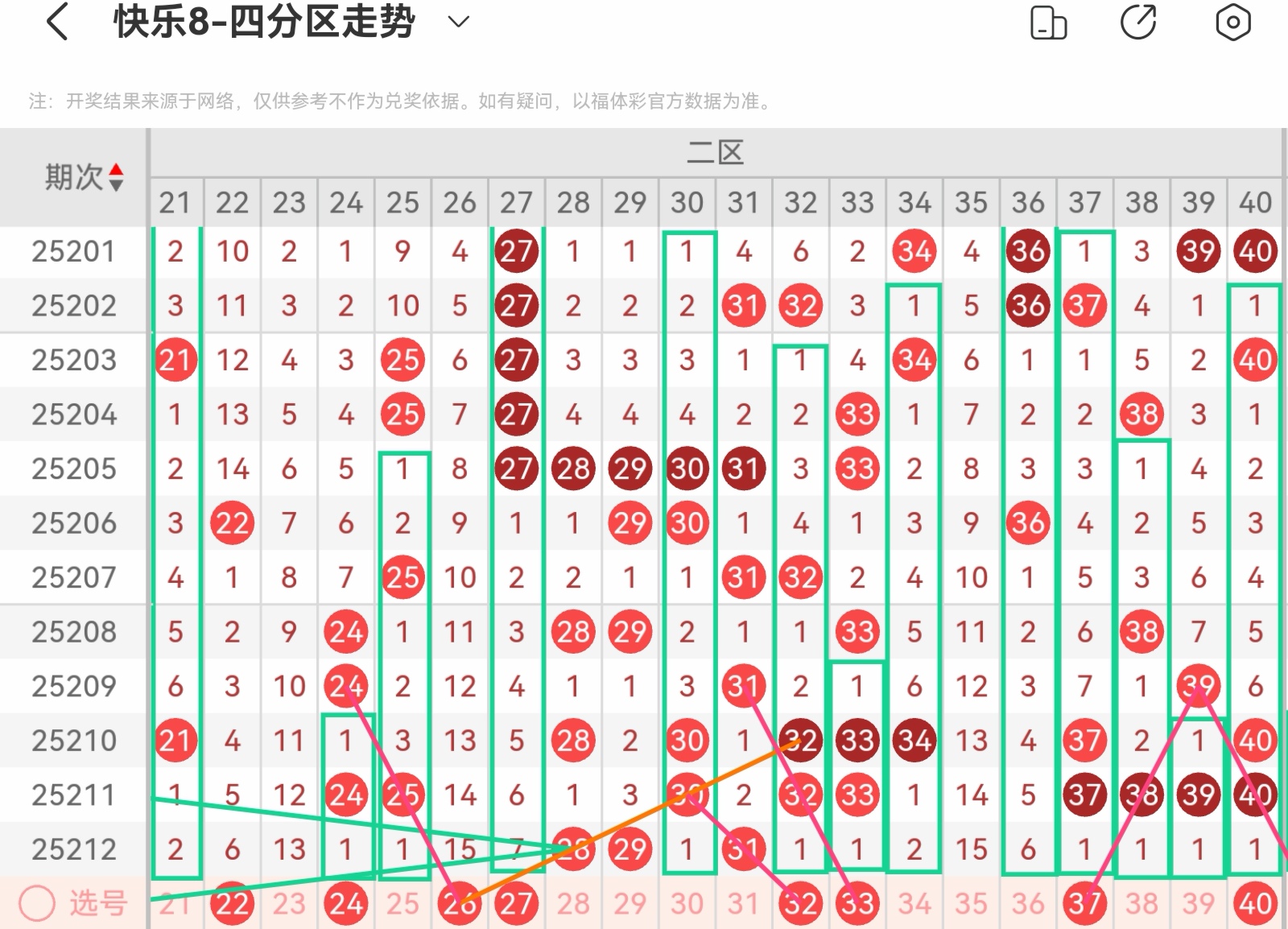 大家好,我是甜丝丝的坏事,主要以快乐八的形态走势、空位走势、遗漏走势以及斜连走势相结合的方法,用公认的四分区走势来进行预测分析,希望能让你有所收获。