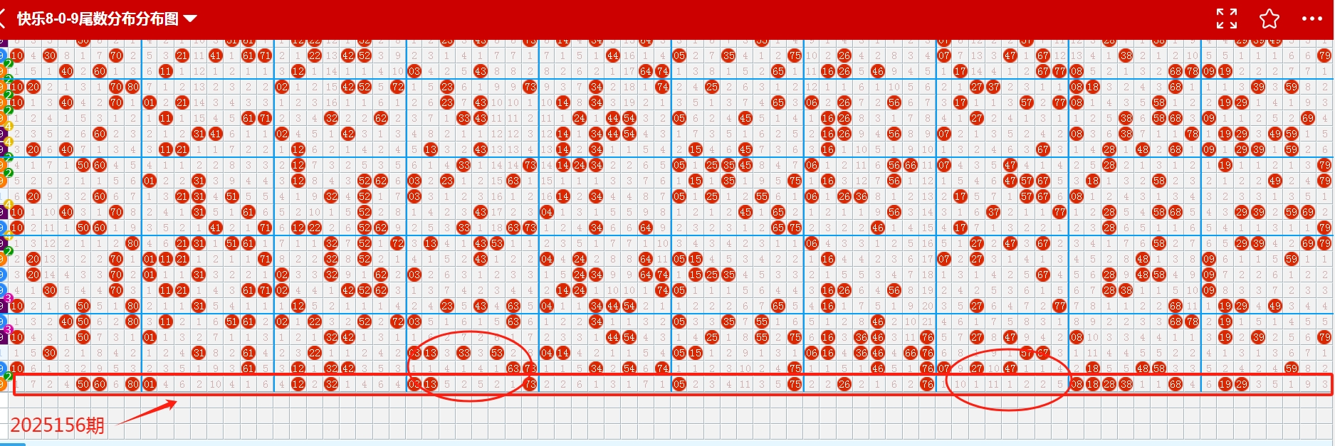 上图是快乐八2025156期的尾码走势图,从图中看0尾到9尾出号个数依次是:0尾号码区开出3个;1尾号码区开出1个;2尾号码区开出2个;3尾号码区开出3个;4尾号码区开出0个;5尾号码区开出2个;6尾号码区开出2个;7尾号码区开出0个;8尾号码区开出5个;9尾号码区开出2个;再看小尾号码(0尾-4尾)区有9码,大尾号有11码;数据比对统计后可以看到8尾出号数量最多,开出了5个中奖号码。本期4、7尾出现断区!由走势比对推断20250157期重点需要关注3、7尾区号码下号热度和增加的概率较大。